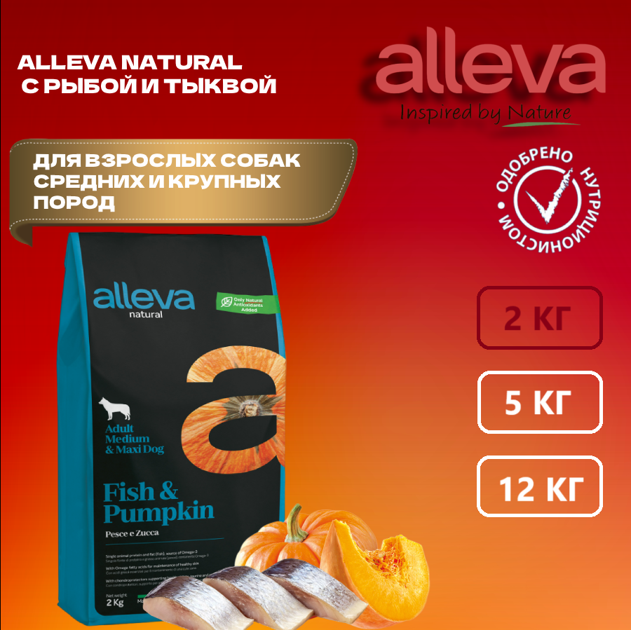 ALLEVA NATURAL ADULT DOG MEDIUM/MAXI FISH & PUMPKIN низкозерновой для взрослых собак средних и крупных пород с рыбой и тыквой (12 кг)
