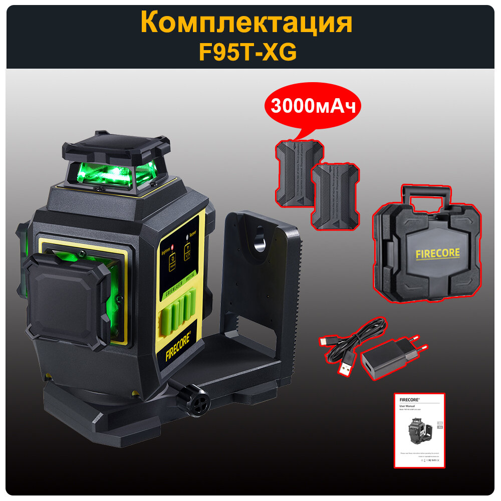 Лазерный уровень/нивелир FIRECORE F95T-XG 12 Линий,Зеленый луч,чемодан,с встроенным L-образным магнитным кронштейном,2 шт. Литиевая батарея информация: