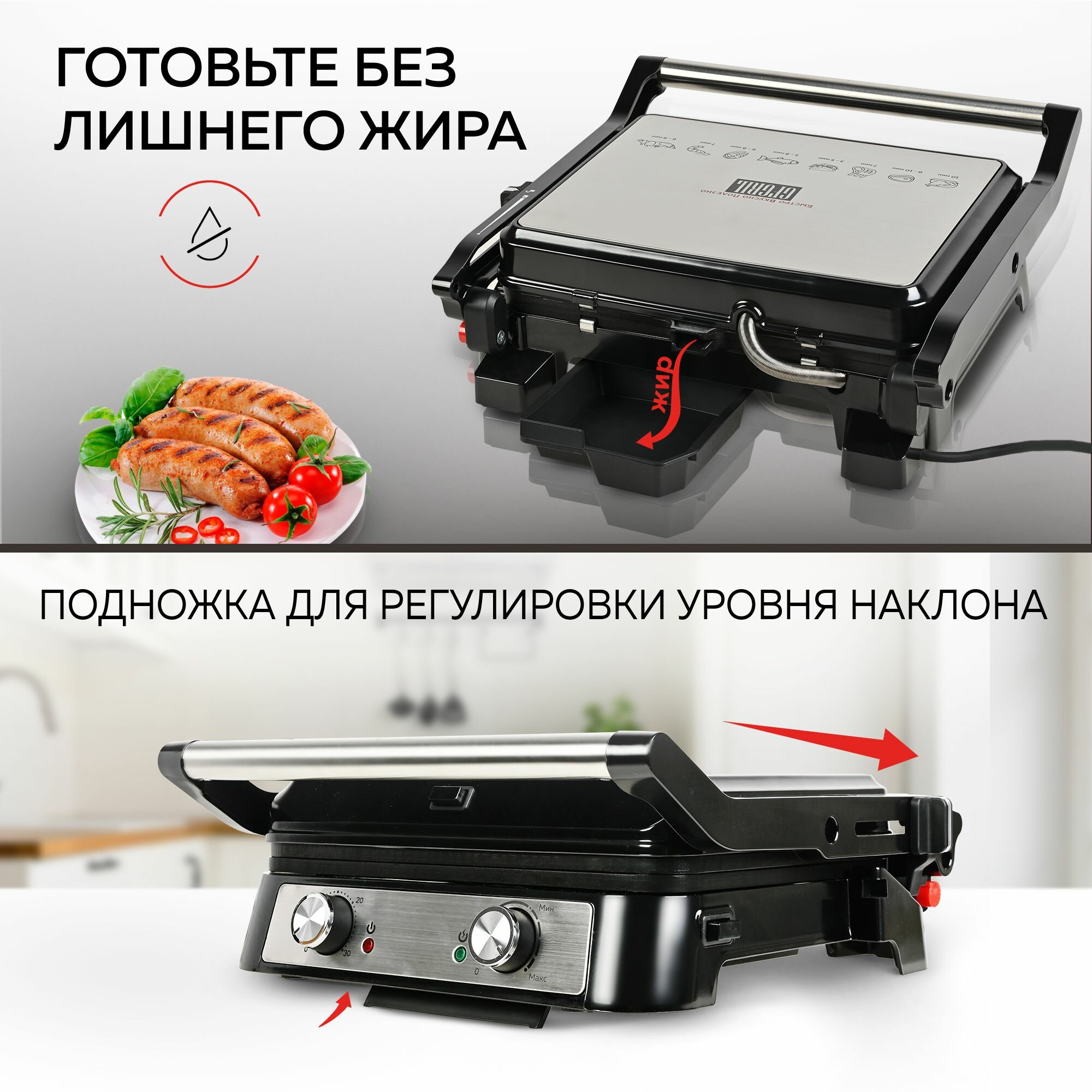 | Особенности | антипригарное покрытие / поддон для сбора жира / Вертикальное хранение / Раскрытие на 180° |