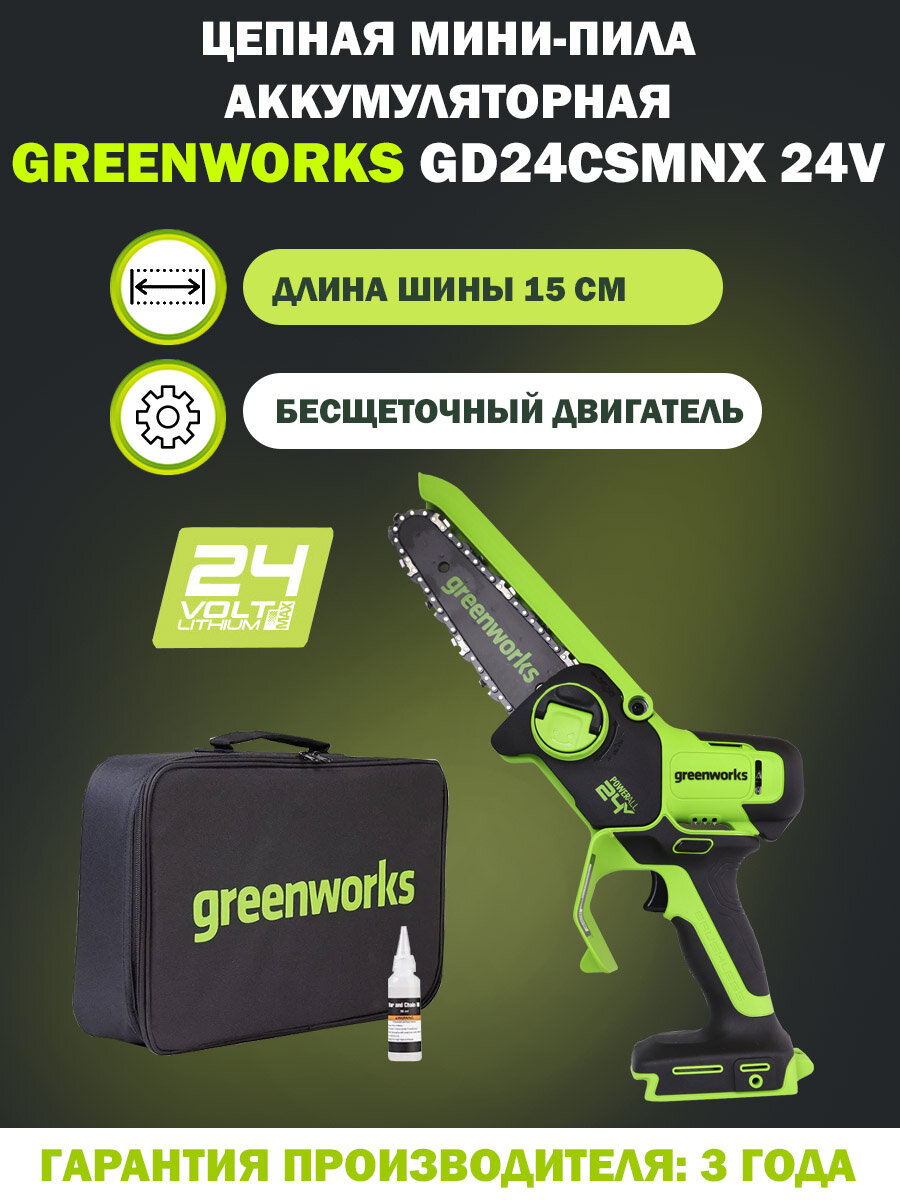 Аккумуляторная цепная мини пила Greenworks GD24CSMNX 24V, 15см, бесщеточная, без АКБ и ЗУ (2008707)