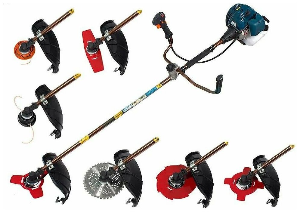 | Комплектация | леска (3 мм), нож, плечевой ремень, кусторез/сучкорез, 5 видов ножей, 2 катушки |