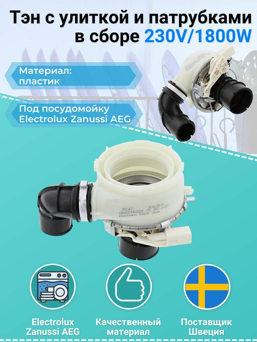 10 цен на Тэн с улиткой и патрубками в сборе 230V/1800W к посудомоечной машине Электролюкс, 140002162232