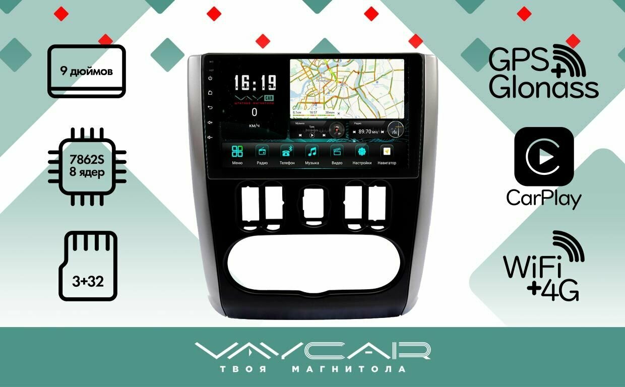 Магнитола Vaycar 09V3 для RENAULT Kaptur 2016+ (Андроид, 3+32, 8 ядер, WiFi, BT, 4G, GPS, QLED 9")