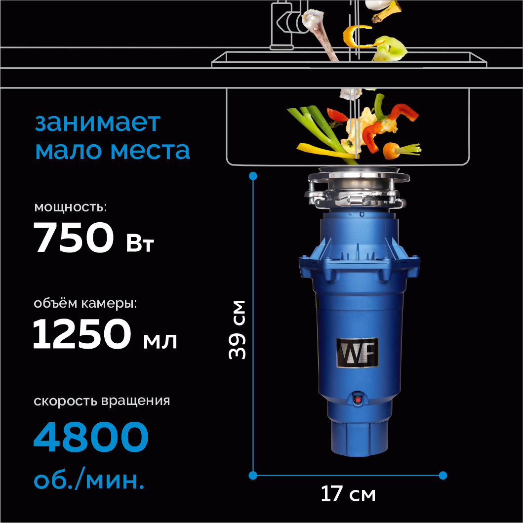 Измельчитель пищевых отходов WASTE FIGHTER F-22 Standard, встраиваемый под раковину, 1.45л, 3200 об/мин, пневмокнопка