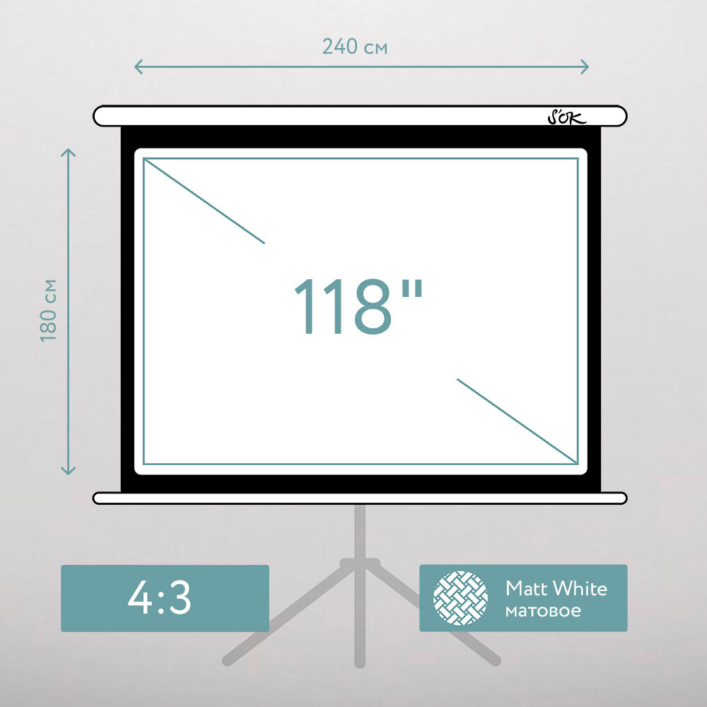 Экран для проектора S'OK SCPST-240x180 118'' 4:3 напольный, на треноге, матовый, белый информация: