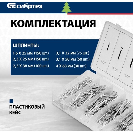 Набор шплинтов, S головки х L: 1,6 х 25,2, 3 х 25,2, 3 х 38, 3, 1 х 32, 3, 1 х 50,4 х 63 мм, 555 предметов Сибртех информация: