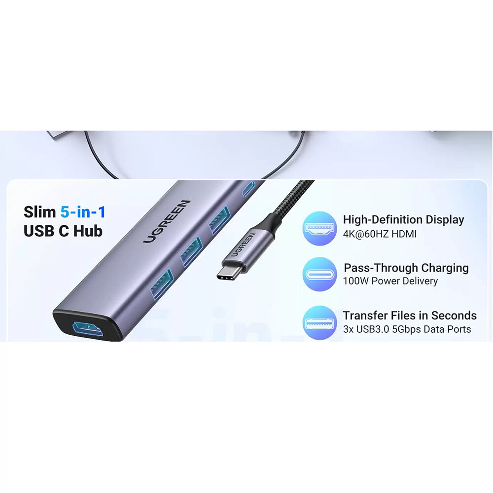 Хаб USB-C 5 в 1 UGREEN CM511 / HDMI 4К 60Гц / 3хUSB-A 3.0 / PD зарядка 100Вт / цвет серый космос (15597) 4 190 ₽