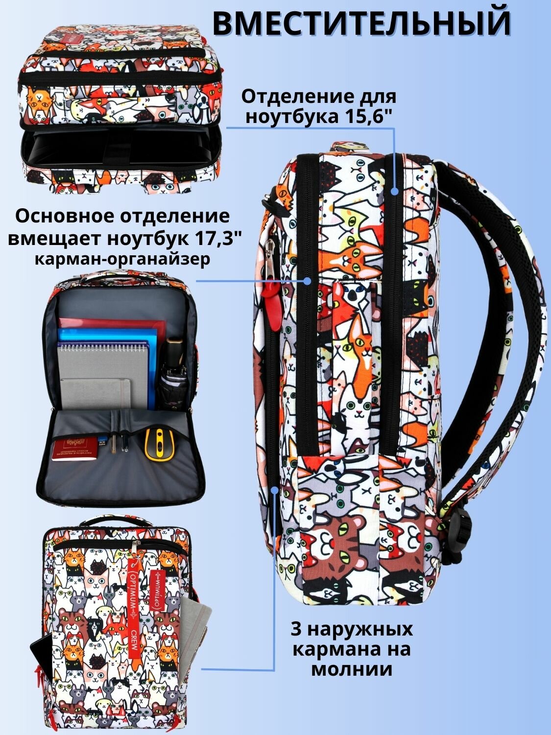Рюкзак для ноутбука 15.6 17 17.3 дюймов мужской женский, котики 4 126 ₽