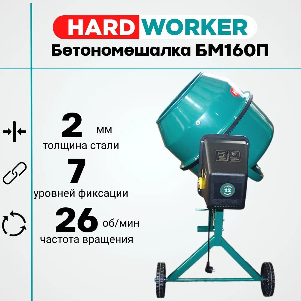 Бетономешалка HARD WORKER БМ160П полиамидный венец, объем 140 литров, мощность 700 Вт, бетоносмеситель электрический информация: