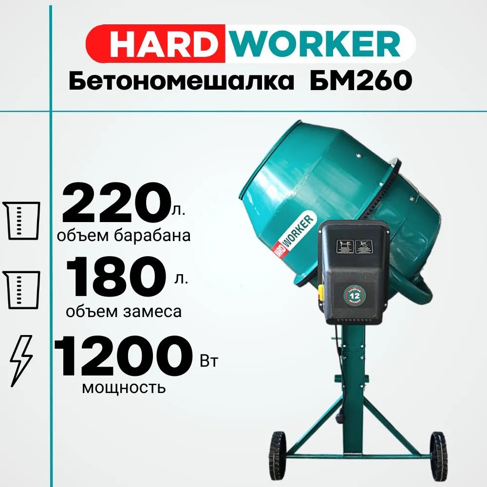 10 цен на Бетономешалка HARD WORKER БМ260 чугунный венец, объем 220 литров, мощность 1200 Вт, бетоносмеситель электрический
