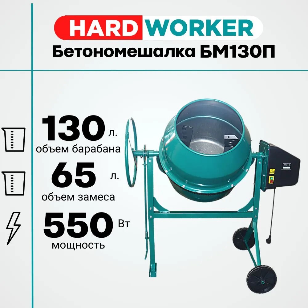Бетономешалка HARD WORKER БМ130П полиамидный венец, объем 130 литров, мощность 550 Вт, бетоносмеситель электрический информация:
