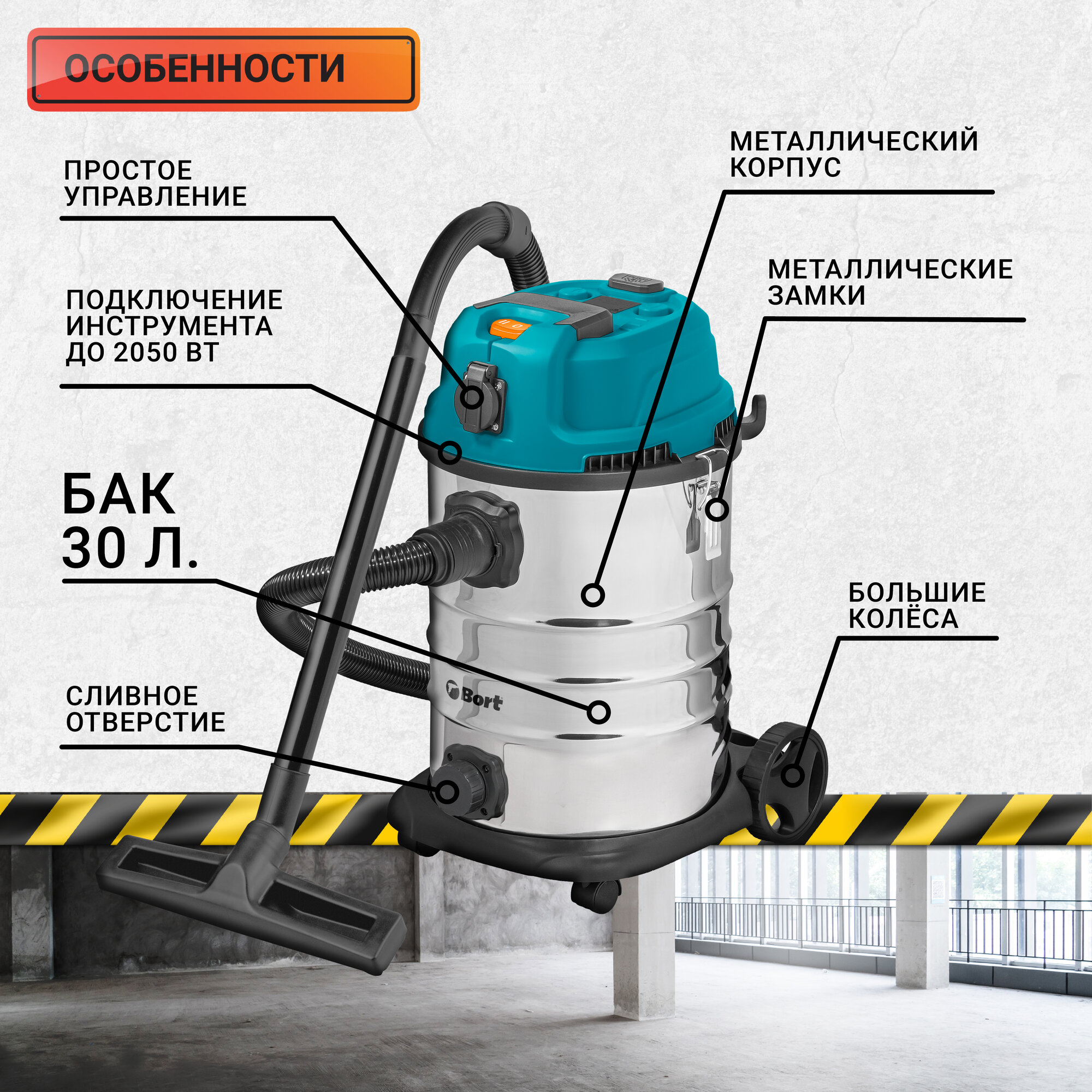 Bort Пылесос для сухой и влажной уборки BSS-1630-STORM {бак 30 л: 1600 Вт: шланг 3 м: всасывание 270 Вт: Уровень шума 78 дБ: Вес 6,5 кг: На 44 700 ₽