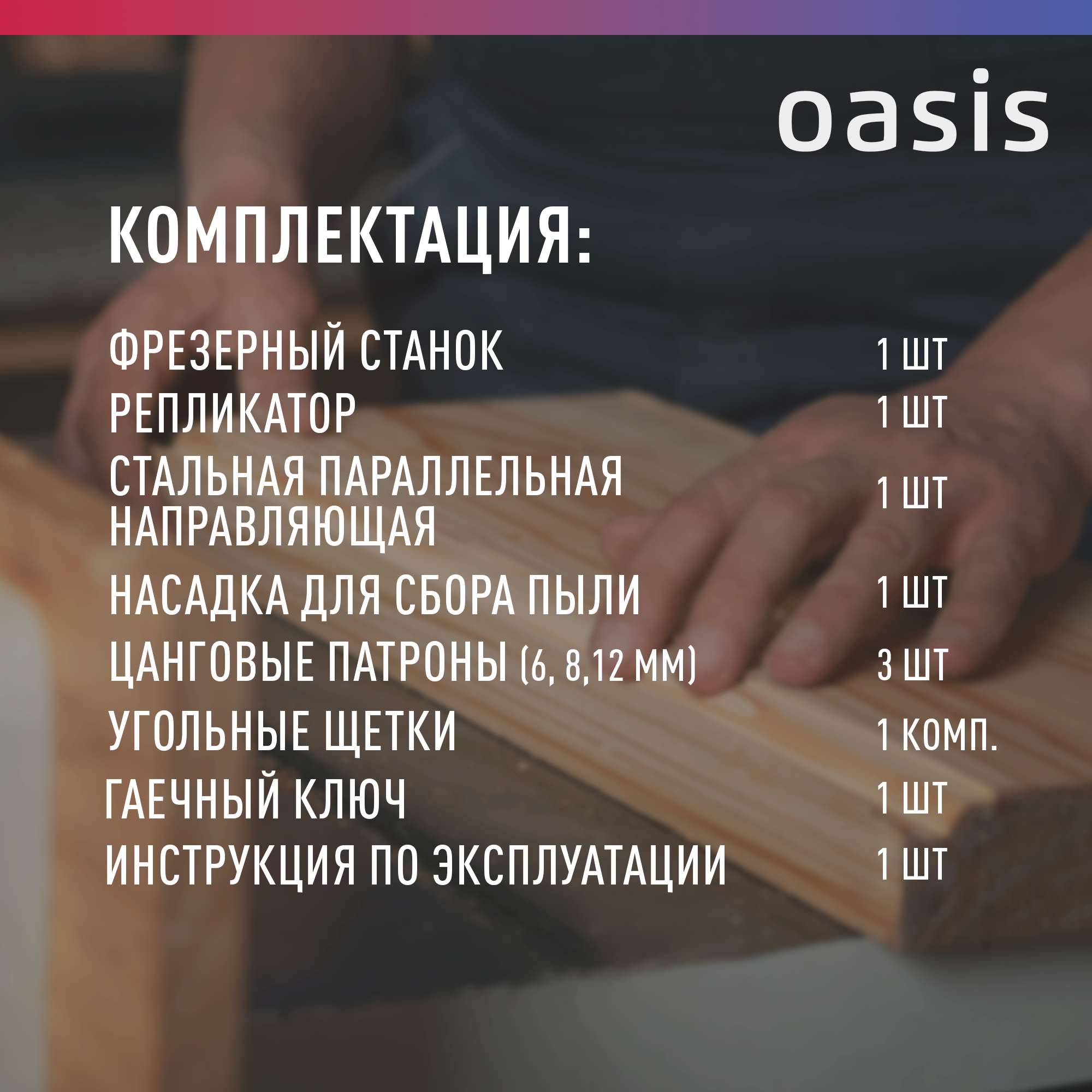 | Подробная комплектация | Фрезерный станок – 1шт. Репликатор - 1 шт. Стальная параллельная направляющая – 1 шт. Насадка для сбора пыли – 1 шт. Цанговые патроны - 3 шт. (6, 8, 12 мм) Угольные щетки – 1 комп. Гаечный ключ - 1 шт. Инструкция по эксплуатации – 1 шт. |