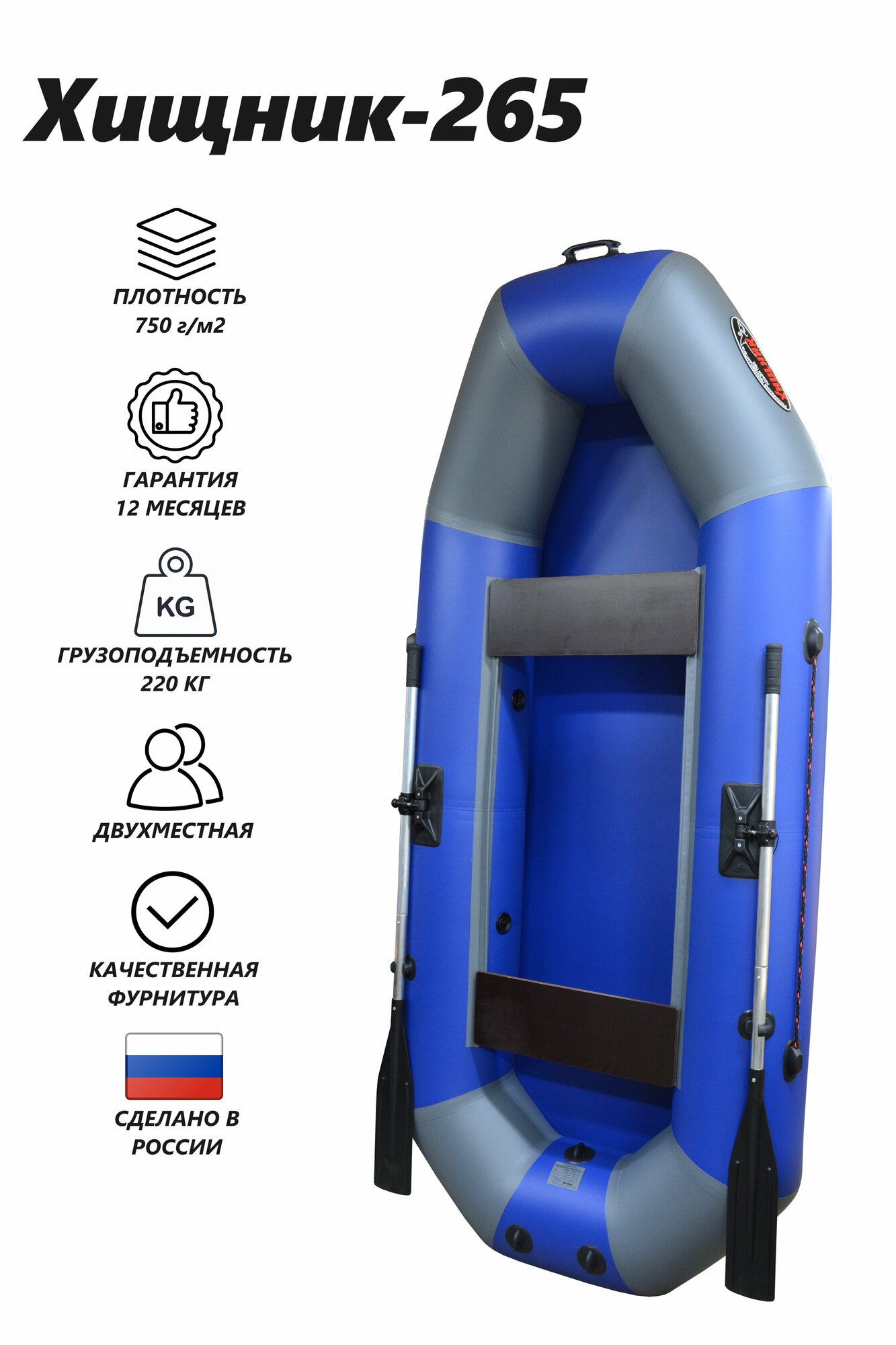Надувная ПВХ лодка Хищник-265 (синий, серый) информация:
