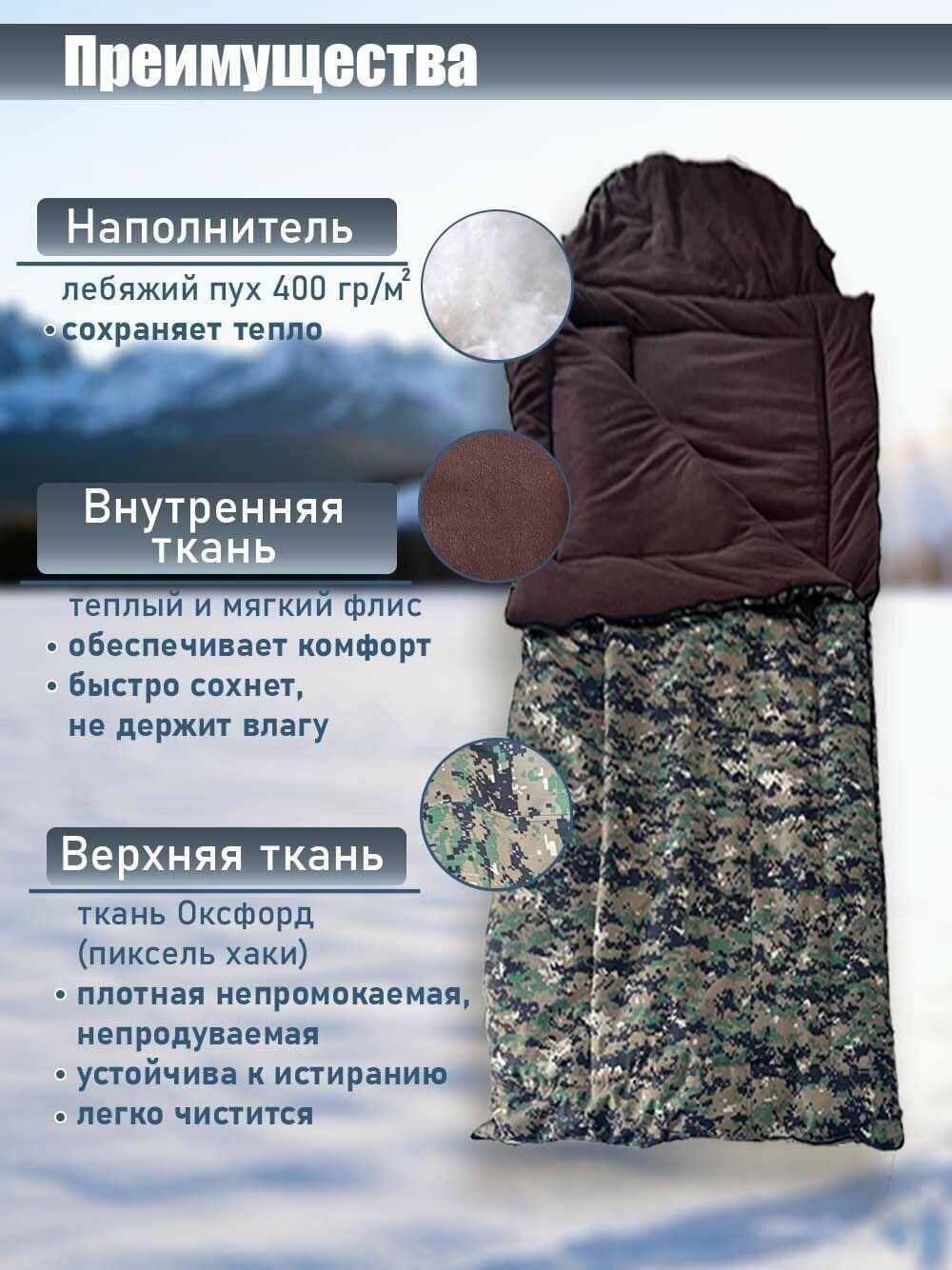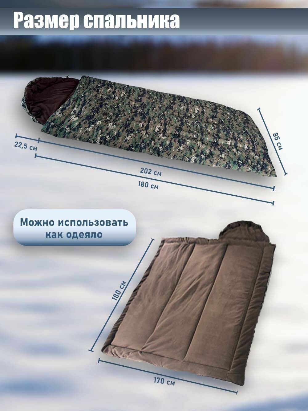 Спальный мешок утепленный армейский с подголовником 225х85 см, спальник туристический зимний до - 35С. Цвет: Пиксель/коричневый. информация: