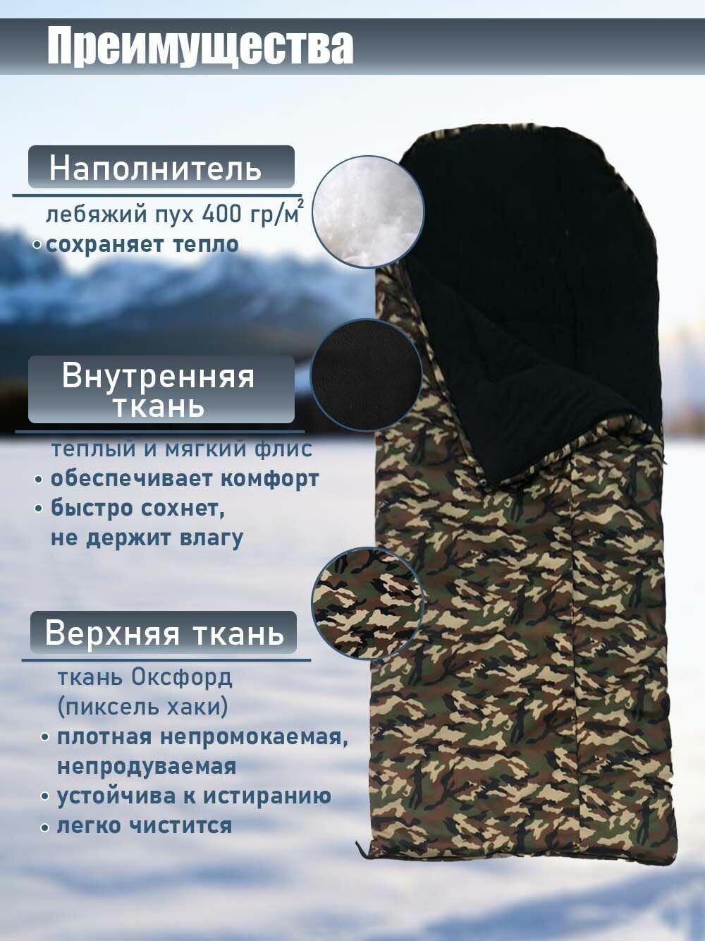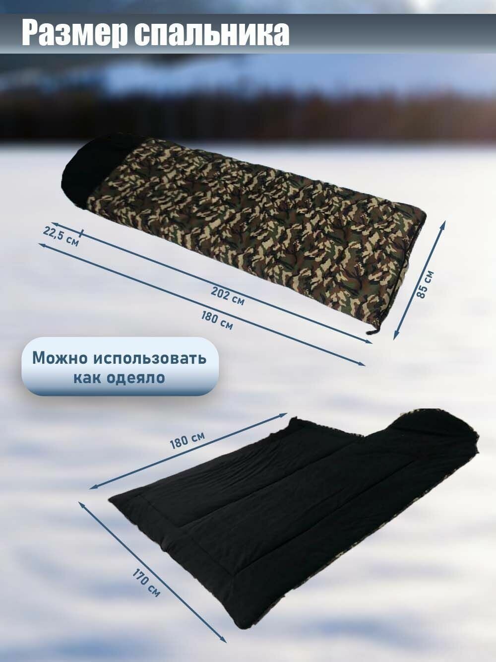 Спальный мешок утепленный армейский с подголовником 225х85 см, спальник туристический зимний до - 35С. Цвет: Камуфляж/черный.