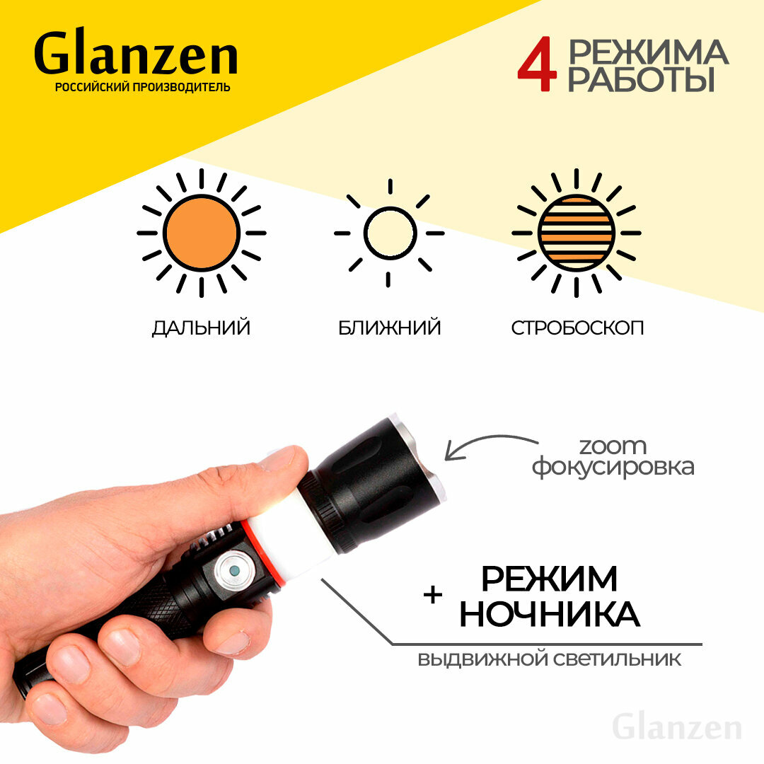 10 цен на Светодиодный ручной аккумуляторный USB фонарь GLANZEN UFL-0300-03