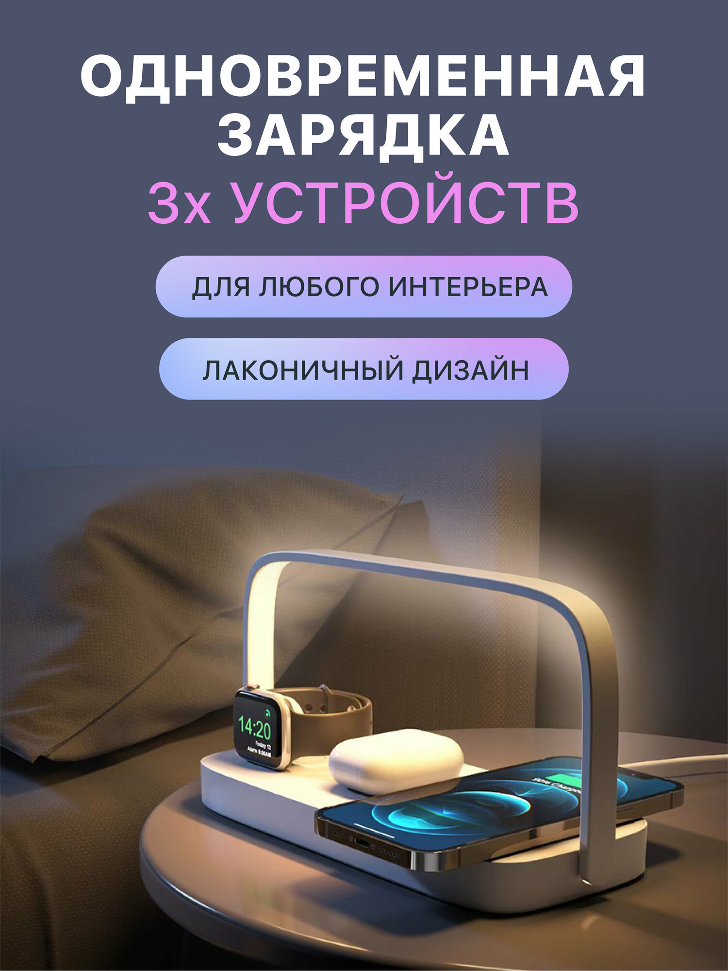 Док-станция, с ночником, для зарядки Apple и Android, портативная, 3 уровня яркости, 15W информация: