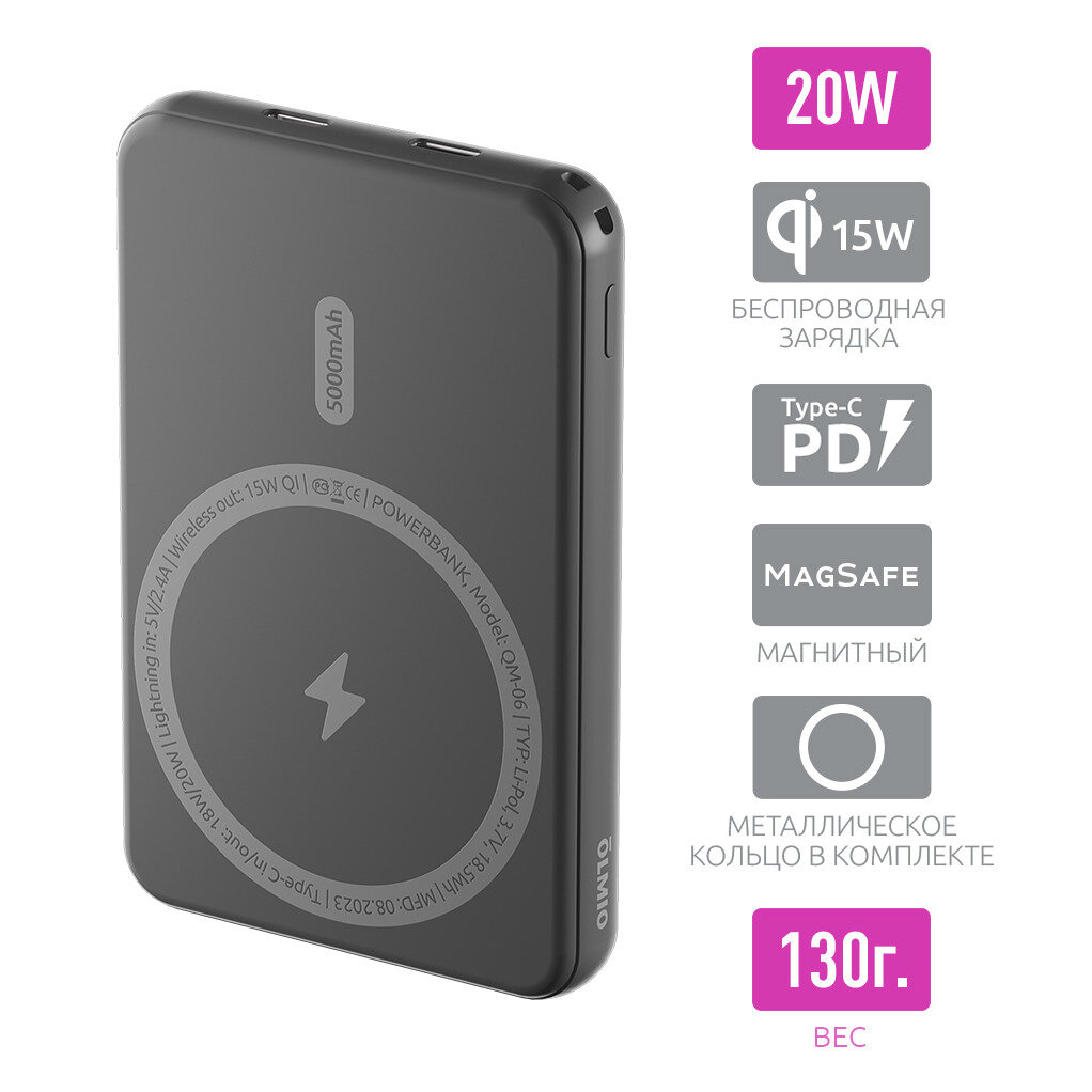 Внешний аккумулятор MagSafe, QM-06, 5000mAh с магнитной беспроводной зарядкой 15W, OLMIO информация:
