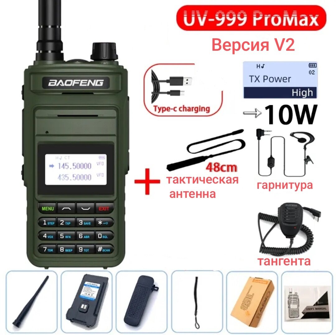 Рация Baofeng UV-999 ProMax 10 Вт класс водонепроницаемости IP X4 с гарнитурой, тангентой и тактической антенной 48см в комплекте цвет зеленый информация: