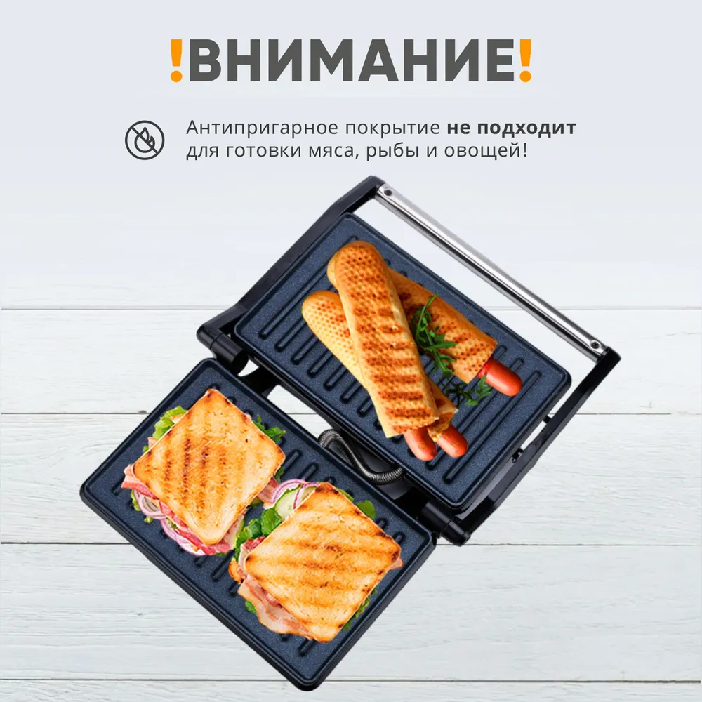 Сэндвичница RageX R781-000 с антипригарным покрытием, открытие на 180 градусов, 750 Вт, черный информация: