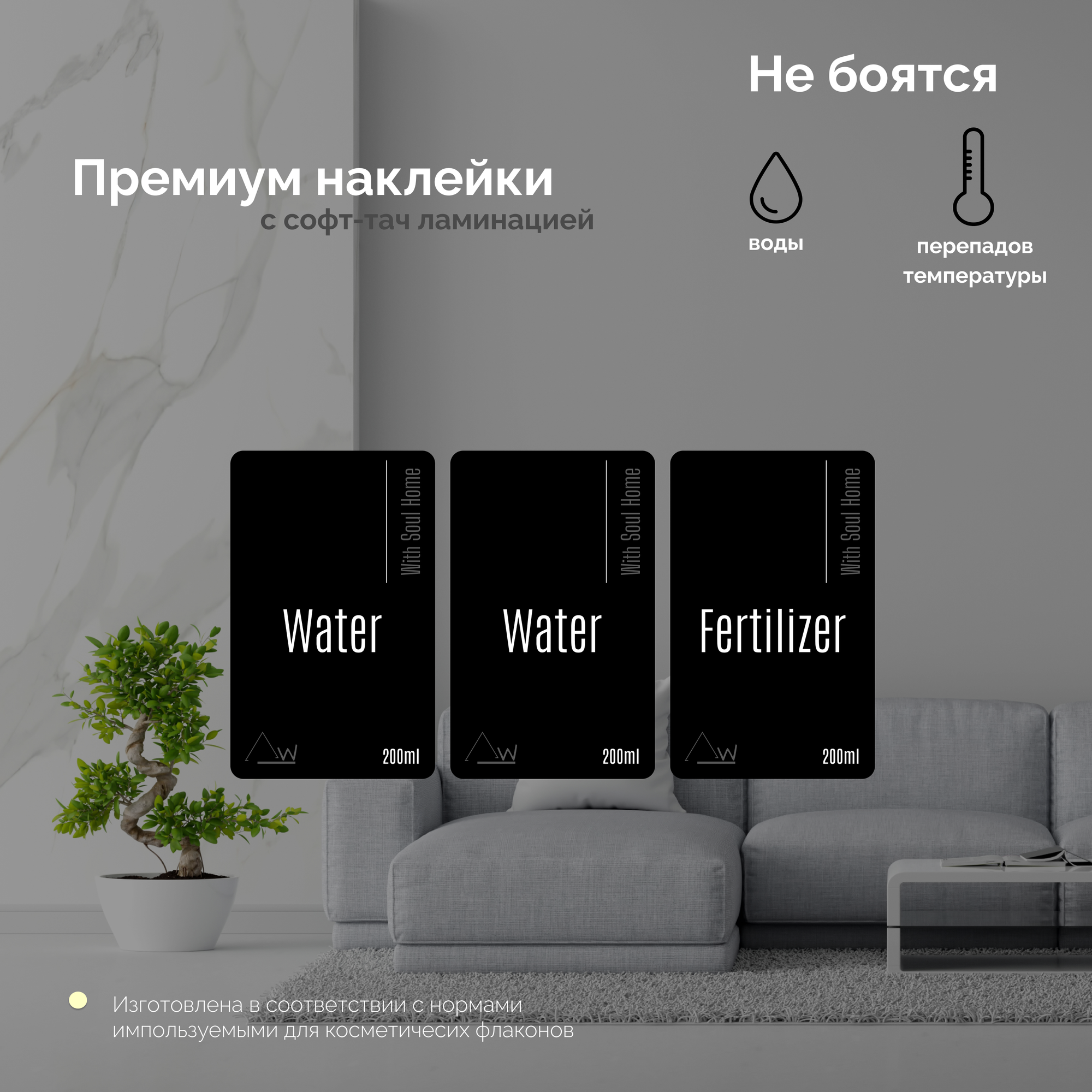 | Комплектация | - Флакон прозрачный 200мл - 2 шт. Наклейки 3 штуки: - Этикетка черная Water- 2 шт. - Этикетка черная Fertilizer- 1 шт. - Распылитель -2 шт. |