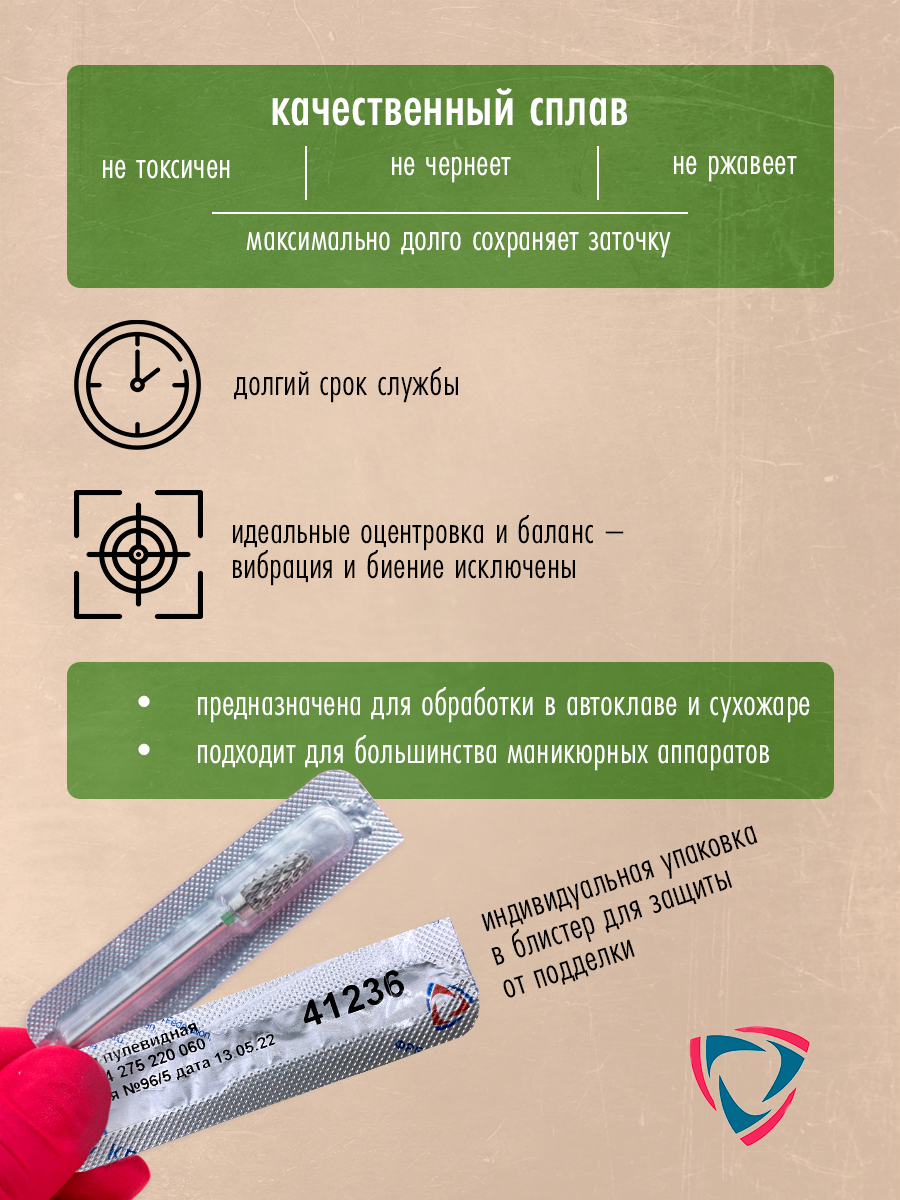 Тайфун PRO, Твердосплавная фреза для педикюра и подологии Винс 02236 (пуля), средняя, D6, L14