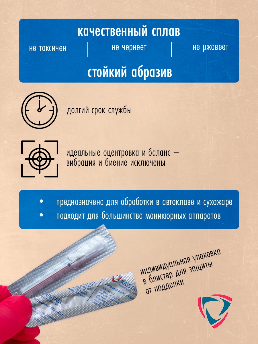 Кристалл, Алмазная фреза (пламя закругл.), D2,3, L080, мелкая, 856.104.263.080.023, 5 шт 319 ₽