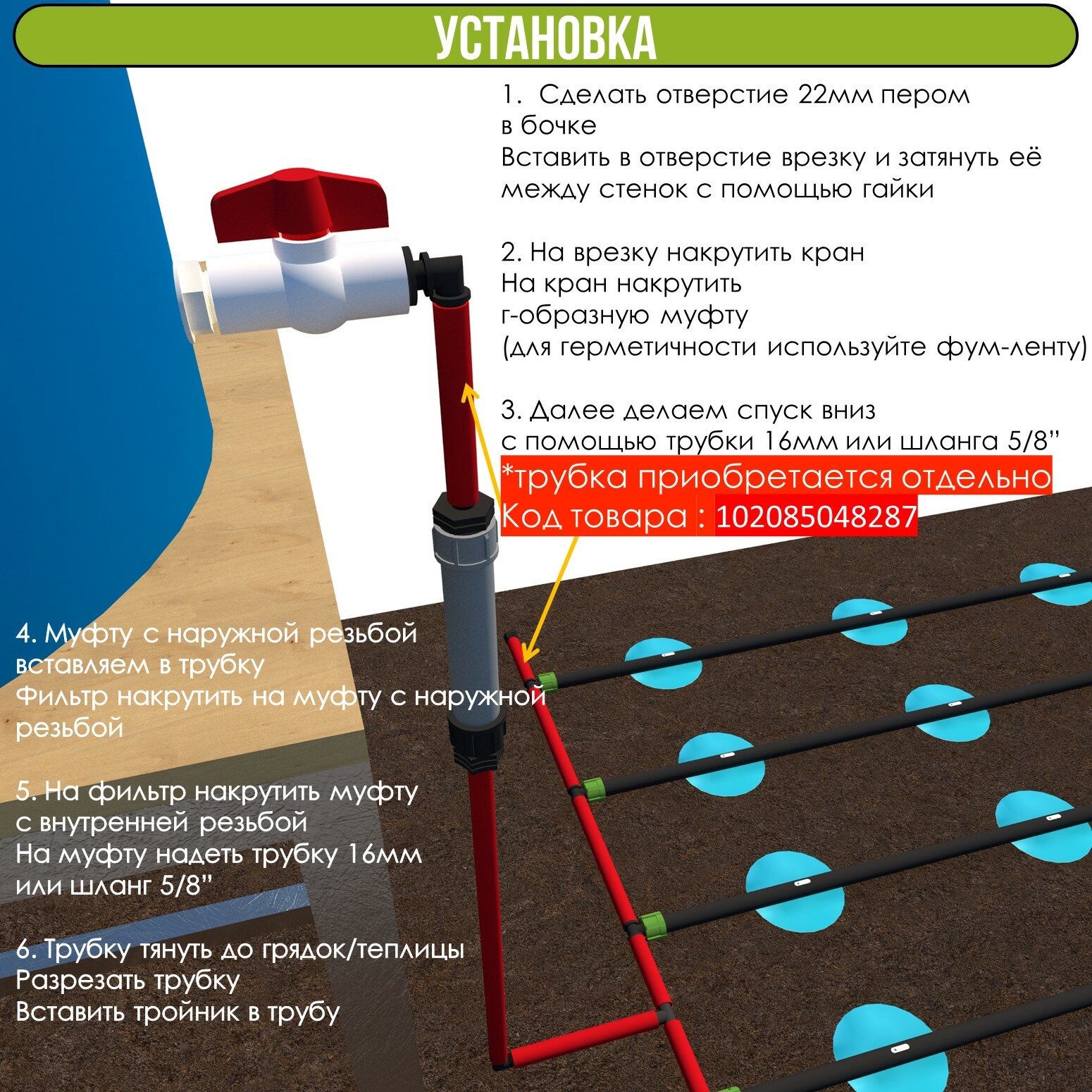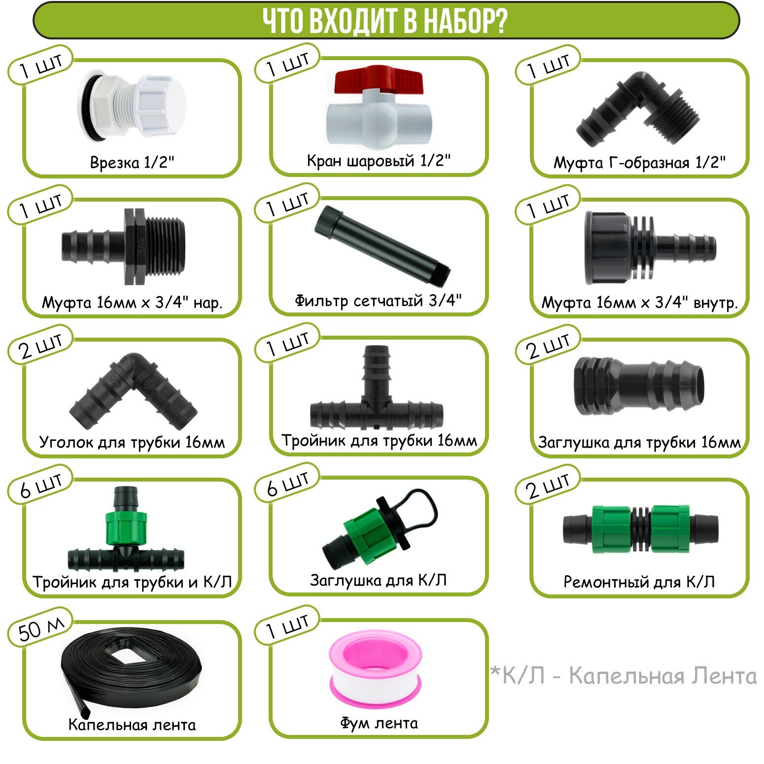 | Комплектация | 1. Врезка 1/2" - 1шт;2. Кран шаровый 1/2" - 1шт;3. Муфта Г-образная 1/2" - 1шт;4. Муфта 16мм х 3/4" наружная - 1шт;5. Фильтр сетчатый 3/4" - 1шт;6. Муфта 16мм х 3/4" внутренняя - 1шт;7. Уголок для трубки или шланга 5/8" - 2шт;8. Тройник для трубки или шланга 5/8" - 1шт;9. Заглушка для трубки или шланга 5/8" - 2шт;10. Тройник для трубки или шланга 5/8" с поджимной гайкой для подключения капельной ленты - 6шт;11. Заглушка с поджимной гайкой для подключения капельной ленты - 6шт;12. Ремонтный соединитель с поджимной гайкой для подключения капельной ленты - 2шт;13. Капельная лента - 50м;14. Фум лента - 1шт; |
