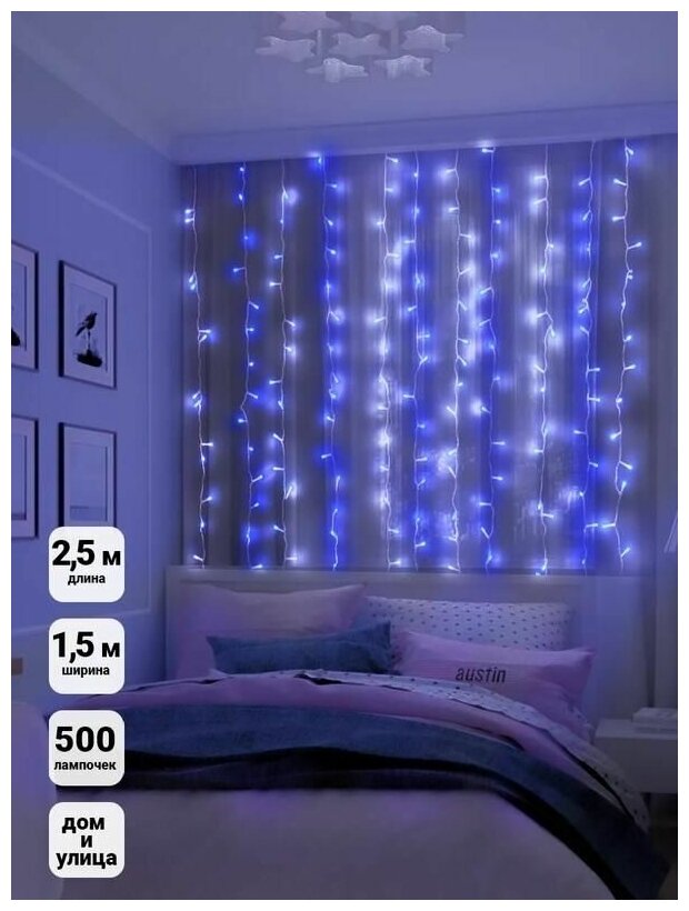 Гирлянда SHLights Световой занавес, 500 LED, 2,4х1,5м, уличный, соединяемая до 8 гирлянд, синий-белый (OLDCL500-BW-E) информация: