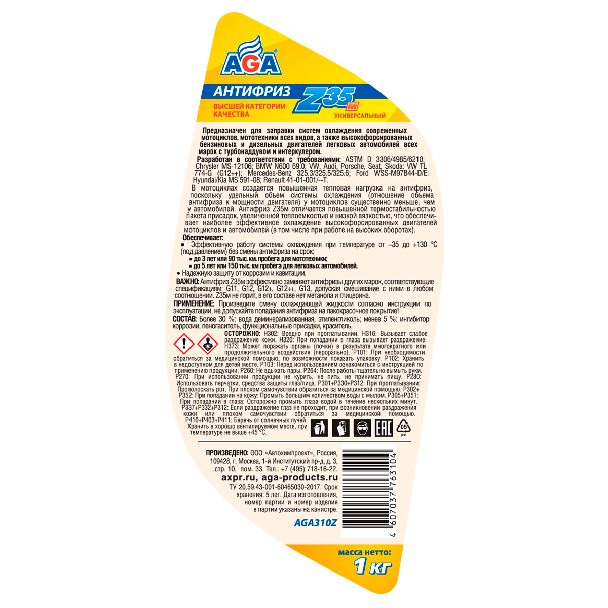 | Дополнительная информация | Антифриз AGA-Z35м – это универсальная охлаждающая жидкость высшей категории качества. ПРЕДНАЗНАЧЕН для заправки систем охлаждения современных мотоциклов, мототехники всех видов, а также высокофорсированных бензиновых и дизельных двигателей легковых автомобилей всех марок с турбонаддувом и интеркулером. |