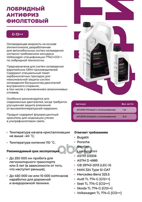 Антифриз Miles Фиолетовый G12++ Готовый 1 Кг Miles арт. AFLR001 информация:
