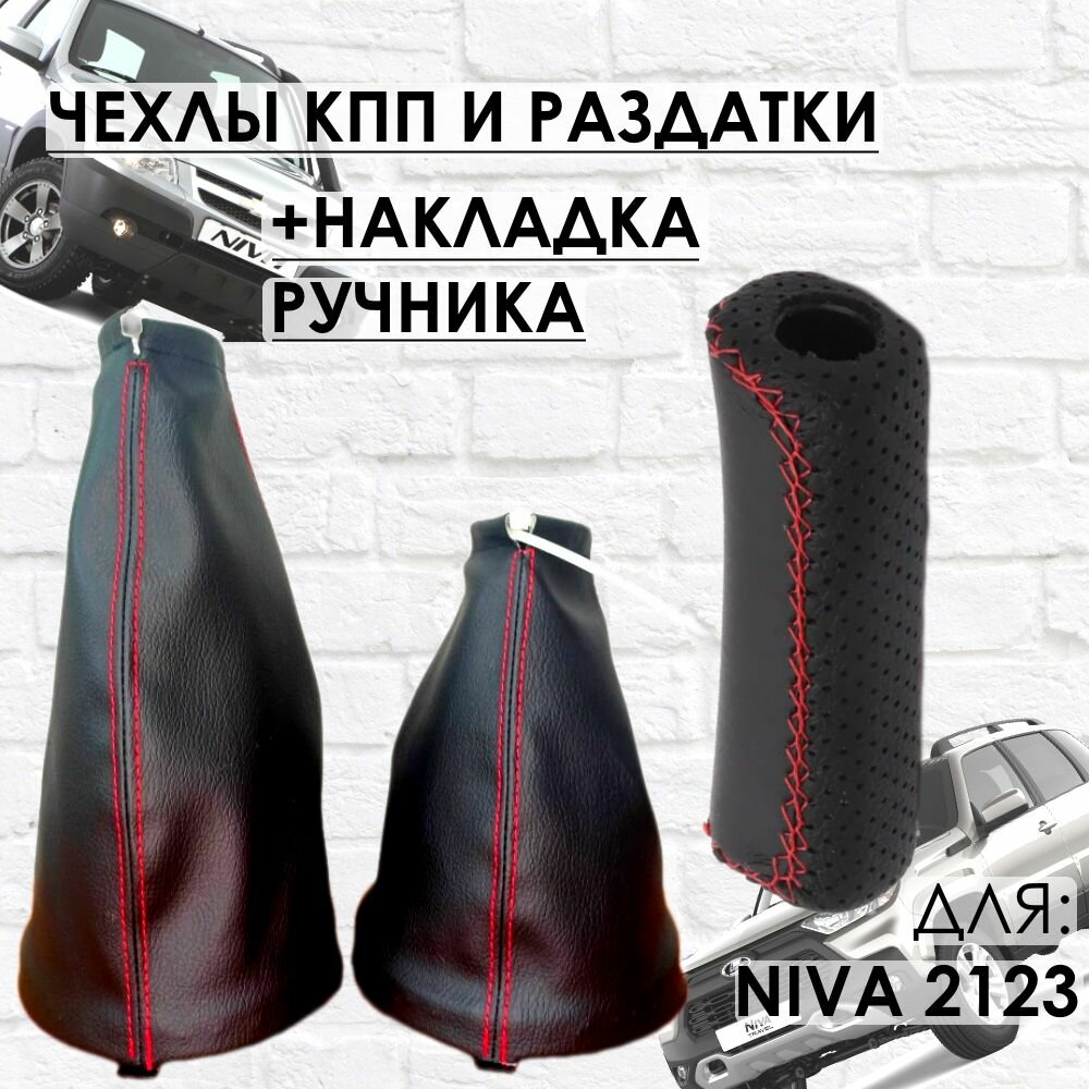 Чехлы на КПП, Раздатку, Накладка на Ручник, Шевроле Нива/Нива Тревел, красная строчка информация: