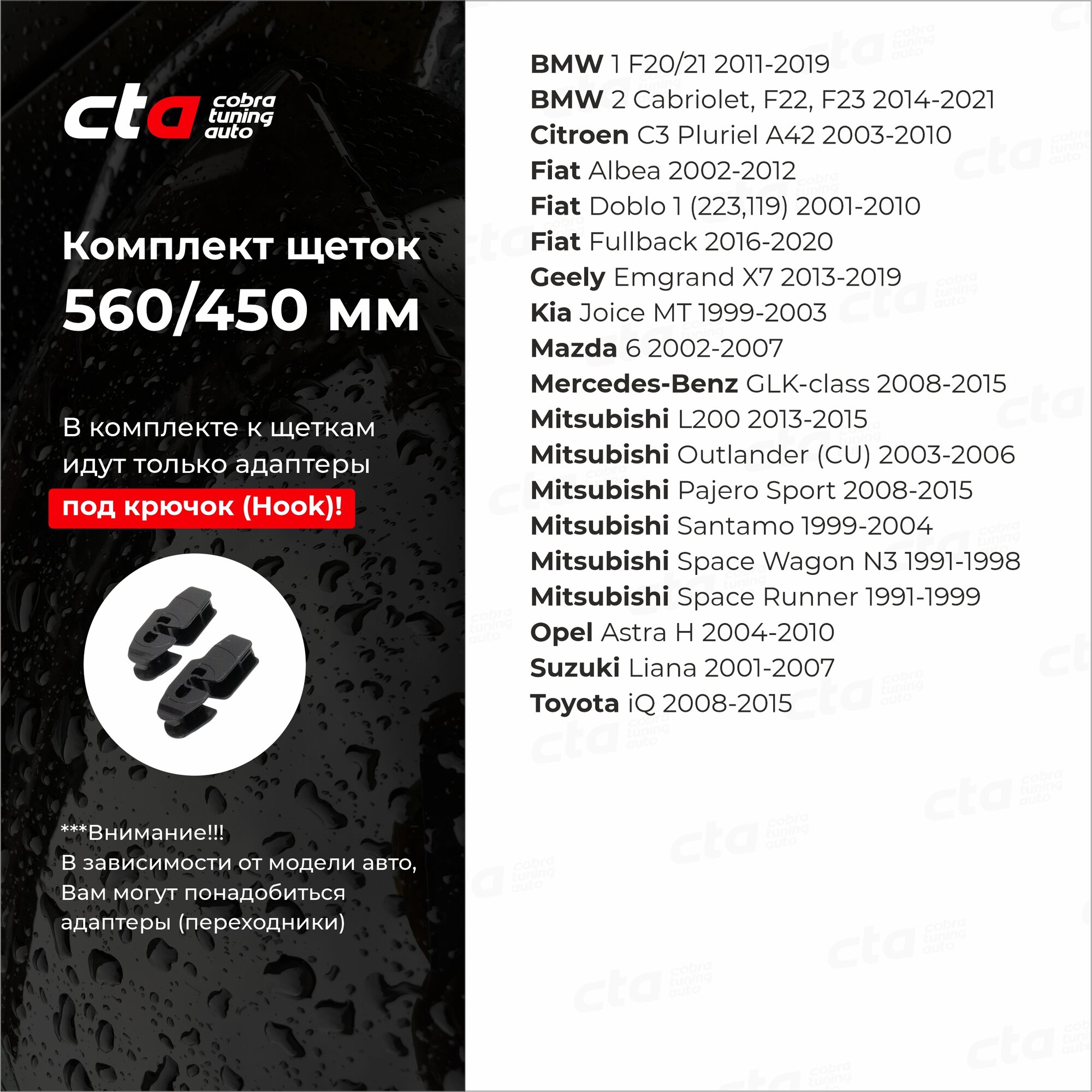 | Подробная комплектация | Гибридные автомобильные щетки, комплект из 2 шт. + 2 адаптера крючок (hook) |