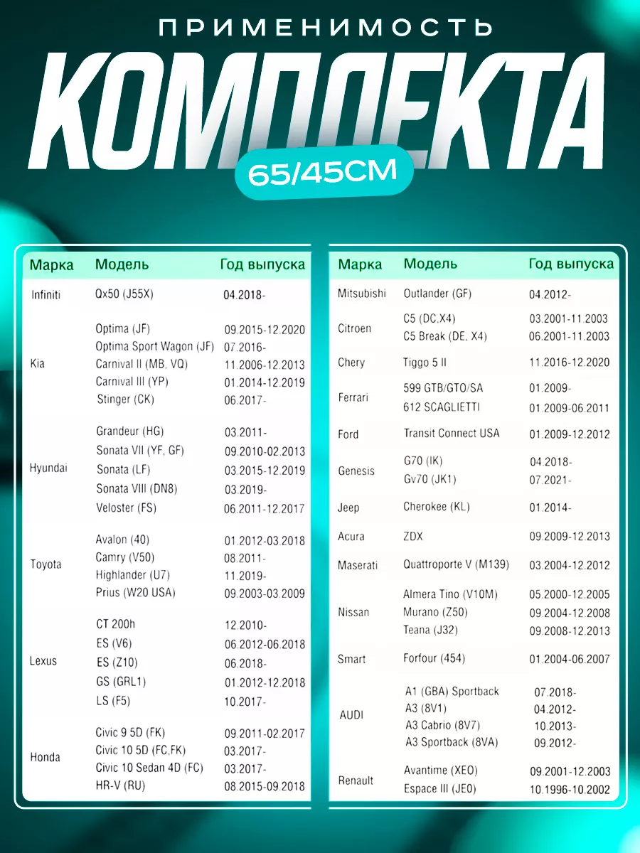 10 цен на Щетки стеклоочистителя 650-450 мм для автомобилей Nissan Teana, Kia Carnival, KIA Optima и других.