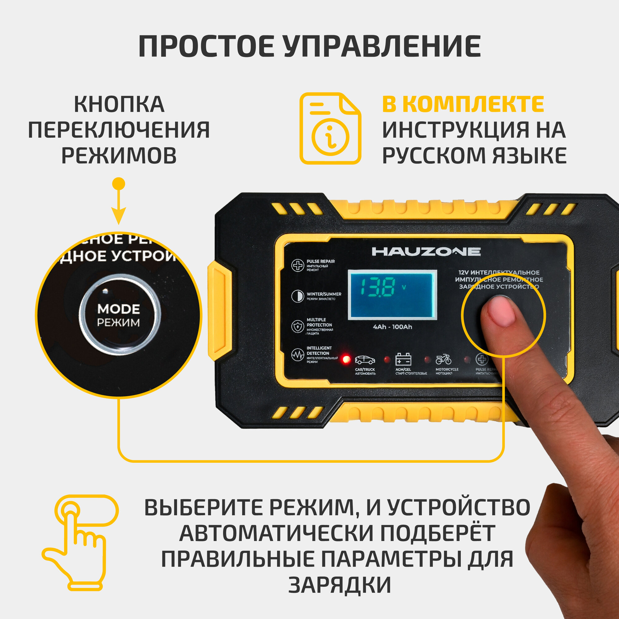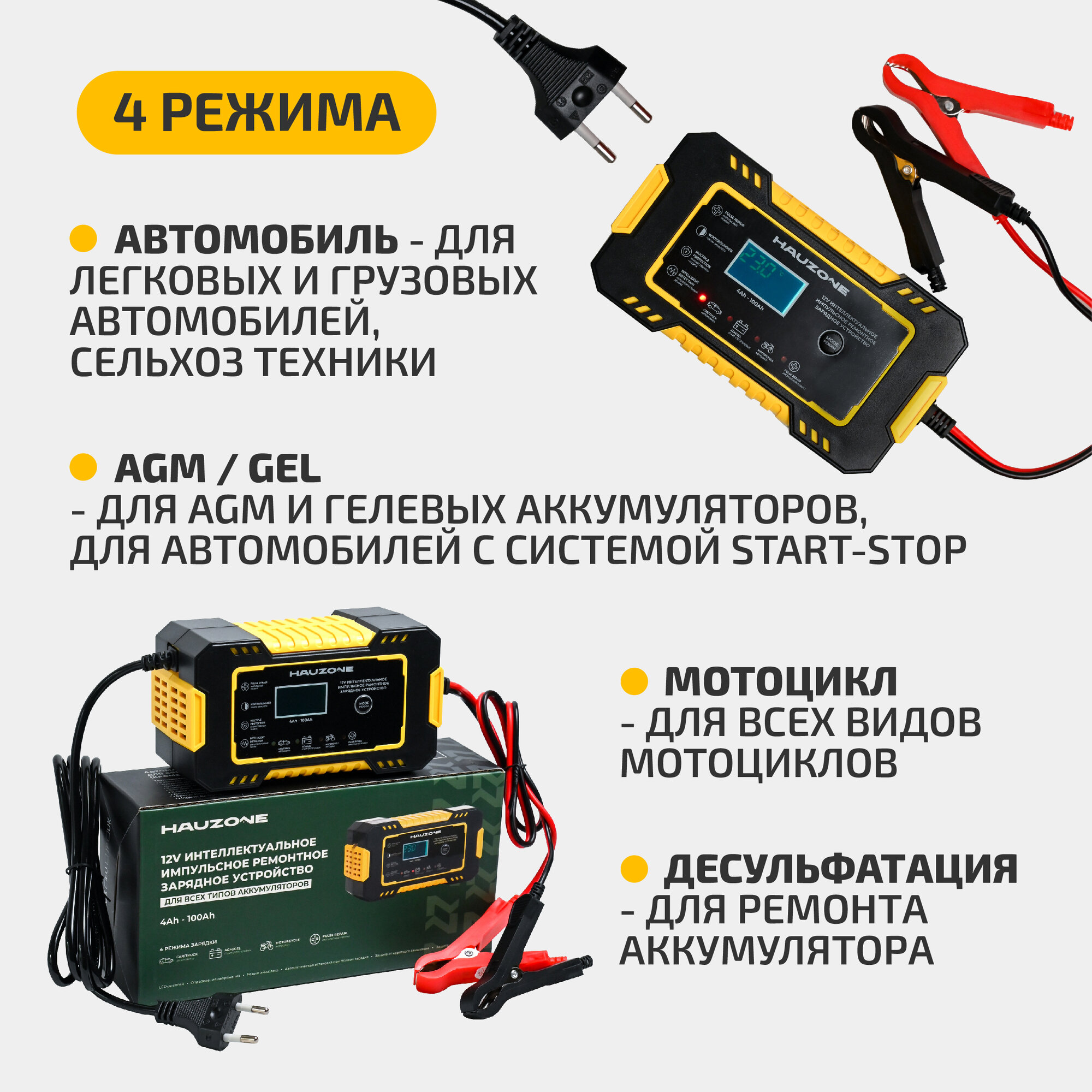 | Функции | автоматическое отключение зарядки / подходит для AGM/GEL аккумуляторов / режим зимней зарядки |