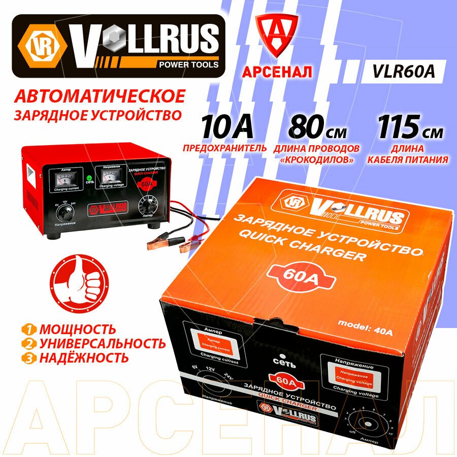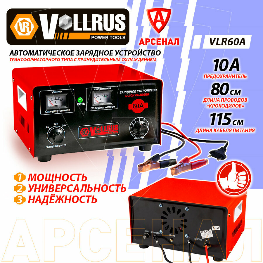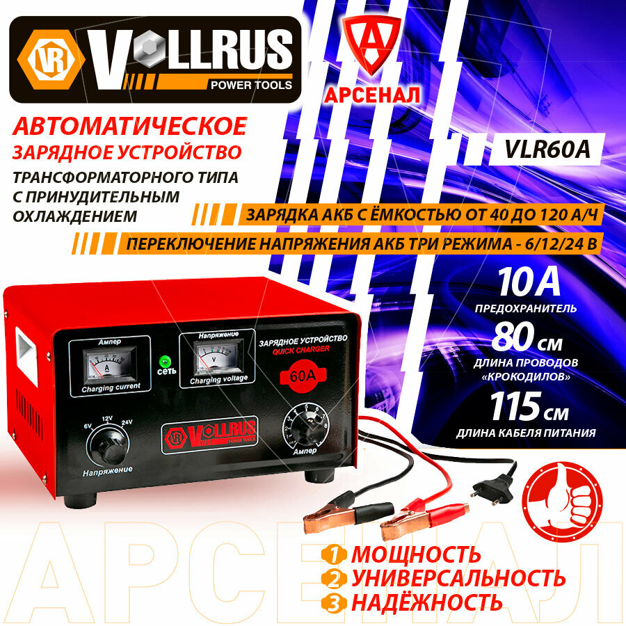 Отзывы на Зарядное устройство автомобильное для АКБ 40-120 А/ч, напряжение 6/12/24V трансформаторное VOLLRUS mod. 40А, VLR60A