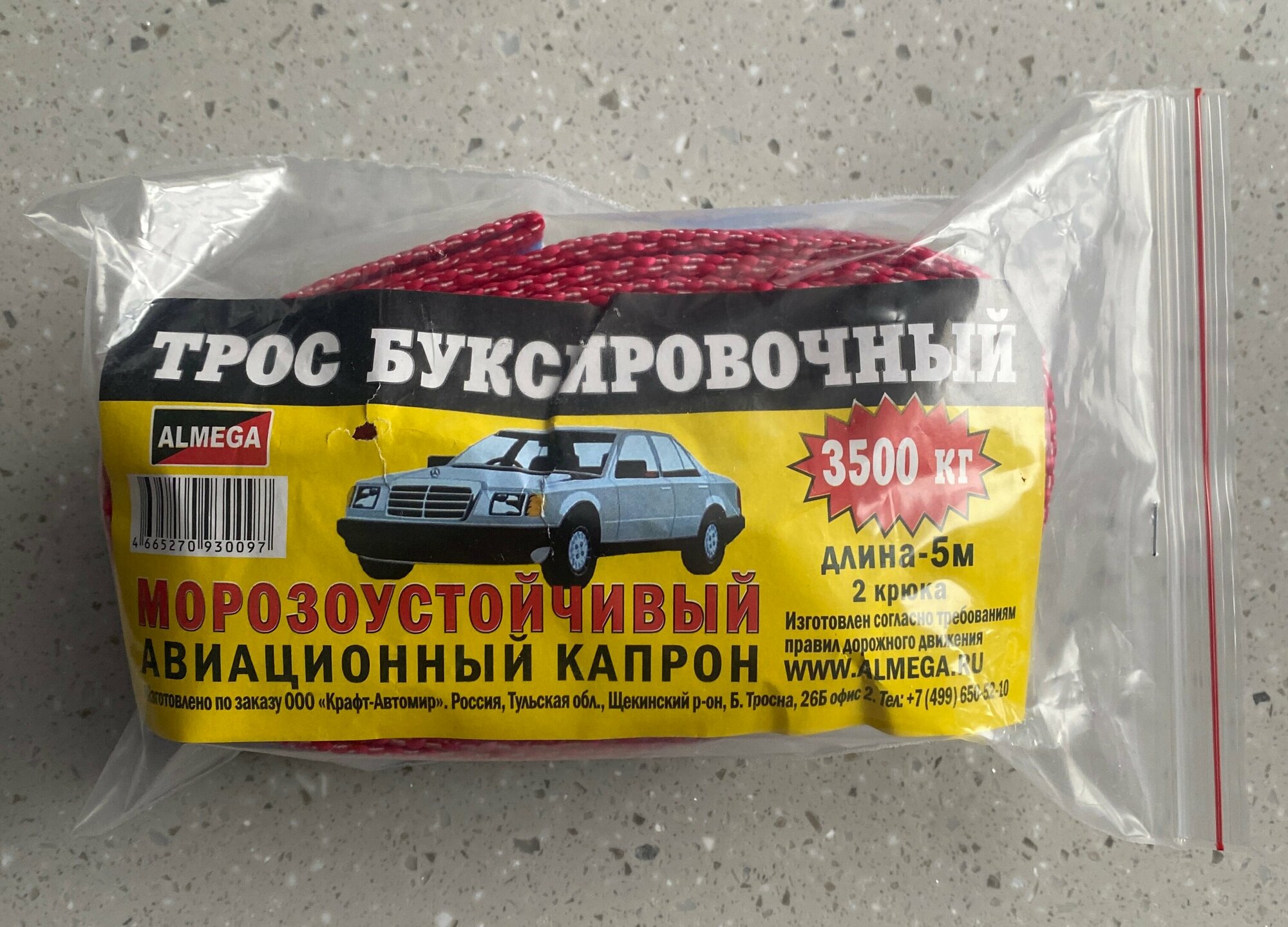 Отзывы на Трос буксировочный для автомобиля, морозоустойчивый капрон,(ALMEGA) 2 крюка, 3,5 тонны, 5 м.