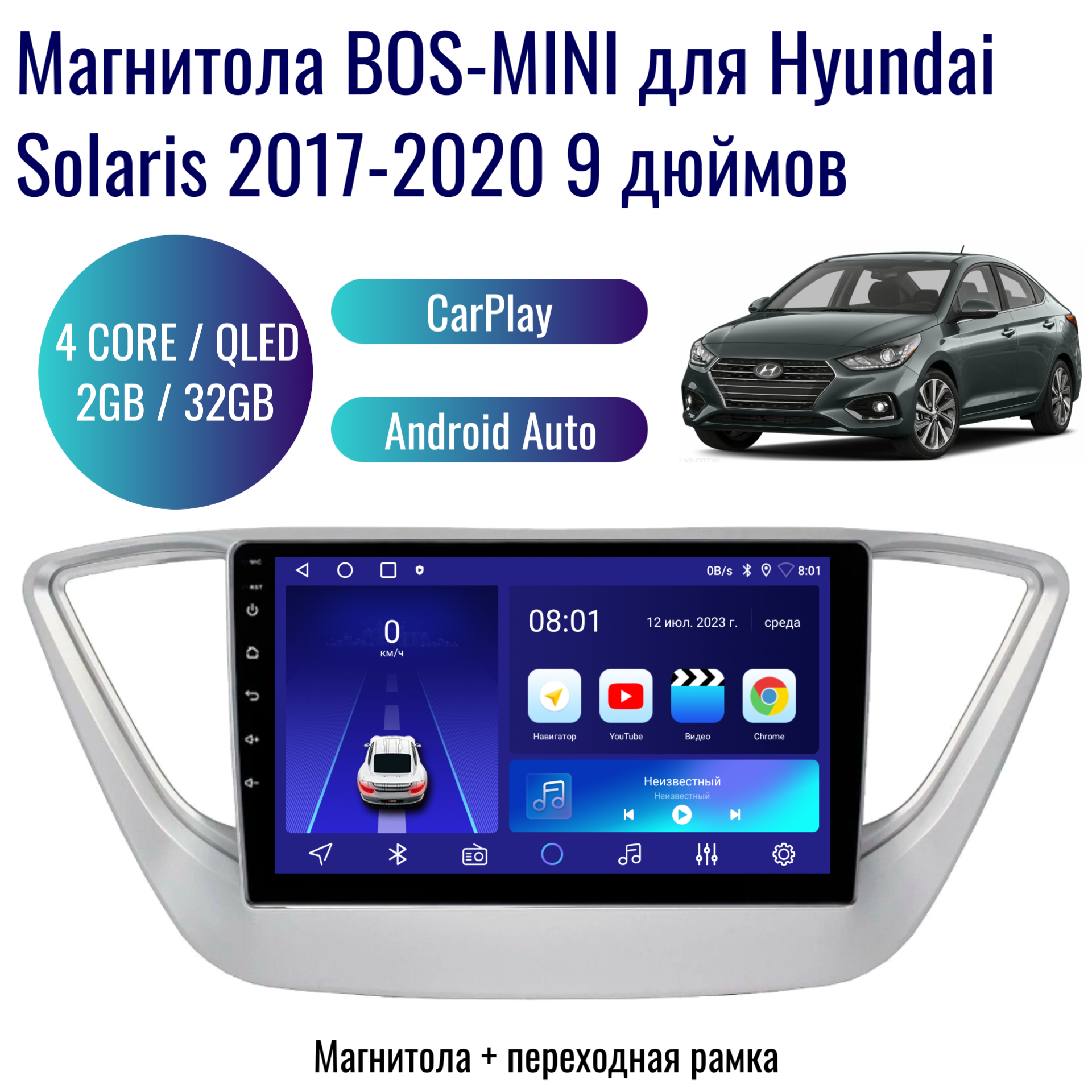 Автомагнитола BOS-MINI Android для Hyundаi Sоlаris 2017-2020 / 4 ядер 2Gb+32Gb / 9 дюймов / GPS / Bluetooth / Wi-Fi / штатная магнитола / 2din / навигатор / CarPlay AndroidAuto информация: