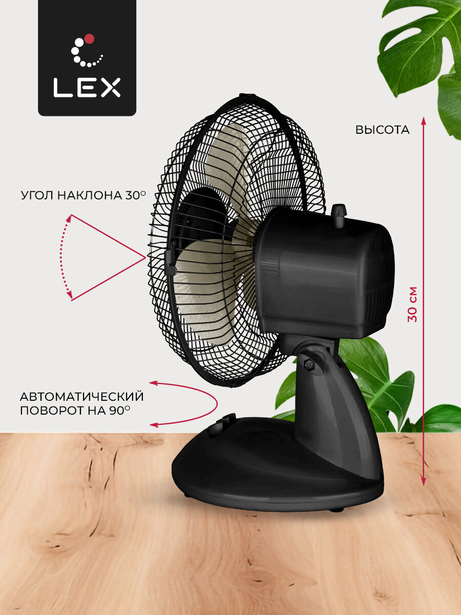 10 цен на Вентилятор настольный LEX LXFC 8379, Мощность 30 Вт, размер лопастей 23 см, тип управления механический, 2 скорости вращения, поворот корпуса на 90*.