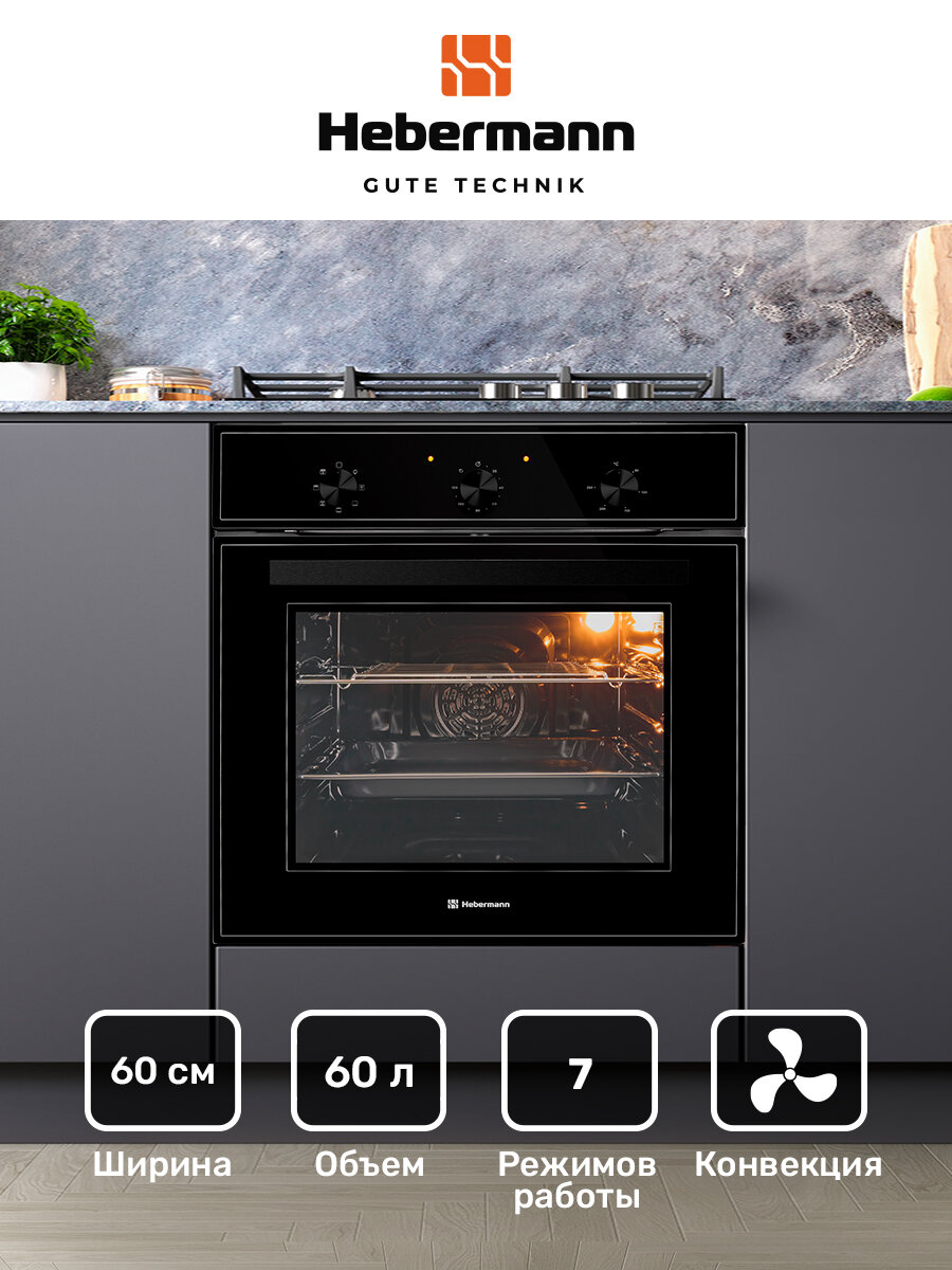 Духовой шкаф HBBO 6007.1 B, черный 6007.1 B, черный, усиленный гриль + конвекция, размораживание, 1 решетка и 1 глубокий противень,двойное стекло у дверцы, 7 режимов работы, размеры шкафа(В*Ш*Г)595*595*530 мм. отделка фасада-стекло 26 247 ₽