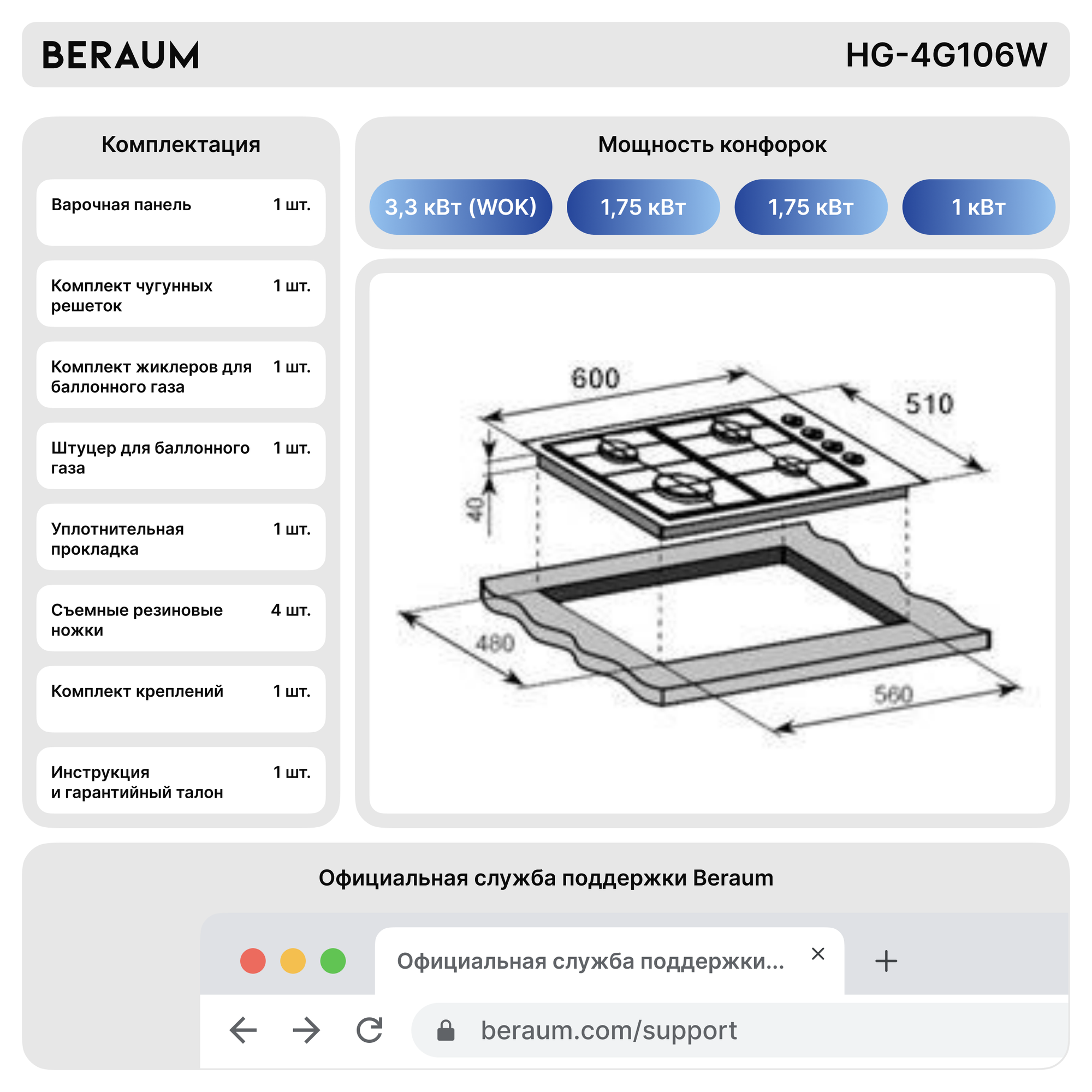 Газовая варочная панель Beraum HG-4G106W с газ-контролем информация: