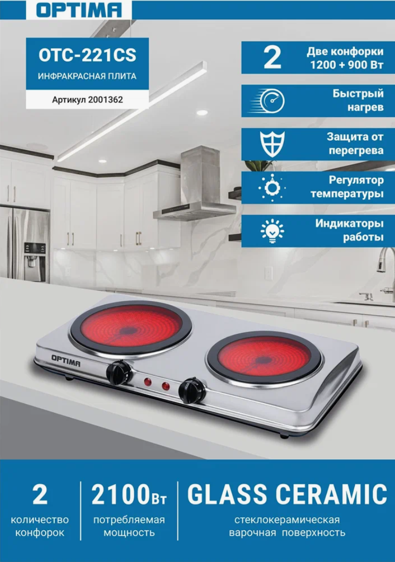 Плита электрическая инфракрасная OPTIMA OTC-221CS (2 стеклокерам.конфорки,индик.работы,1200+900Вт) информация:
