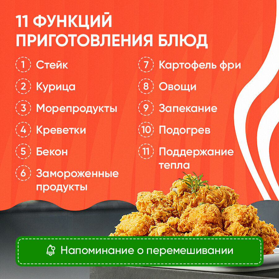 | Особенности | 11 автоматических программ; управление сенсорное/ Wi-Fi; диапазон температур 170-204 С; размер шампура 21 см; автоматическое отключение; установка времени приготовления; звуковой сигнал; защита корзины от выпадения; защита от перегрева; 100 рецептов в приложении |