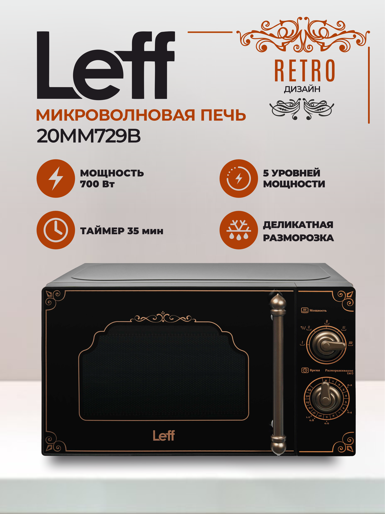 Микроволновая печь Leff 20MM729B, 20л, 700 Вт, ретро, черный информация: