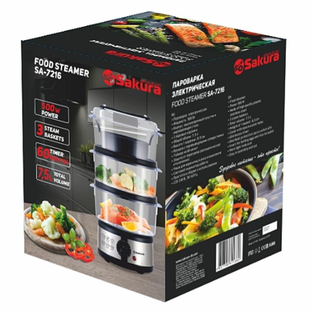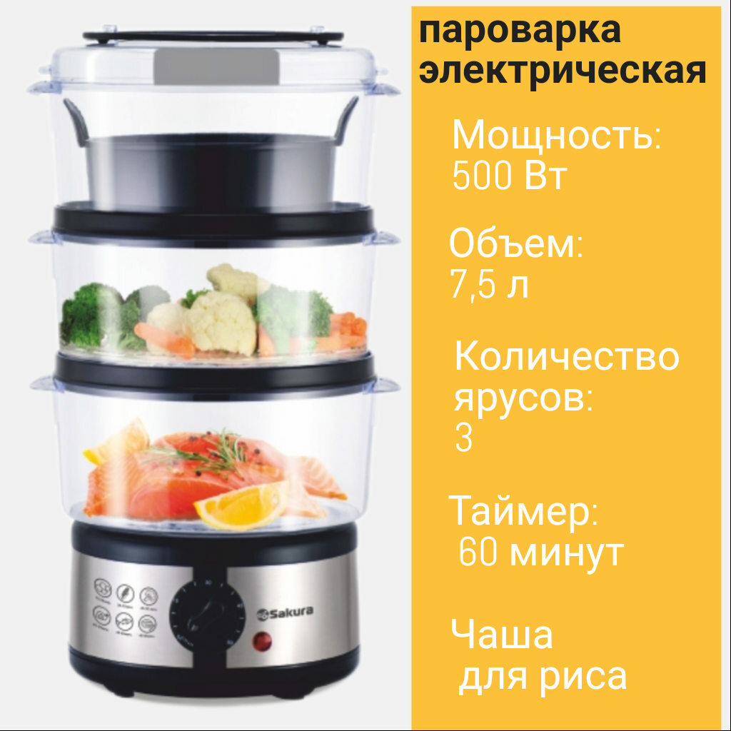 10 цен на Пароварка мантоварка мантышница электрическая Sakura SA-7216,7,5л, 500Вт, с углублением для варки яиц и чашей для риса (OL)