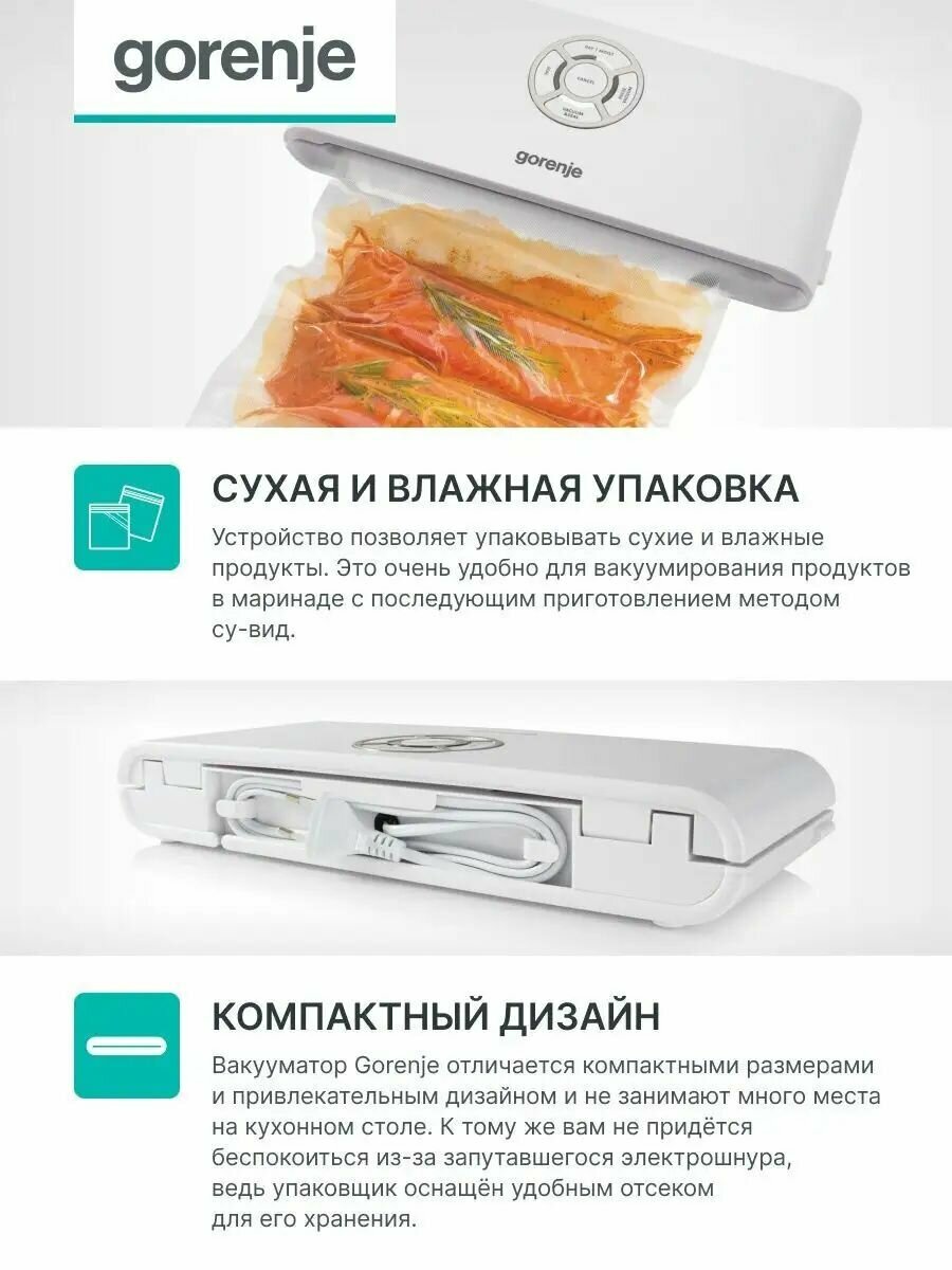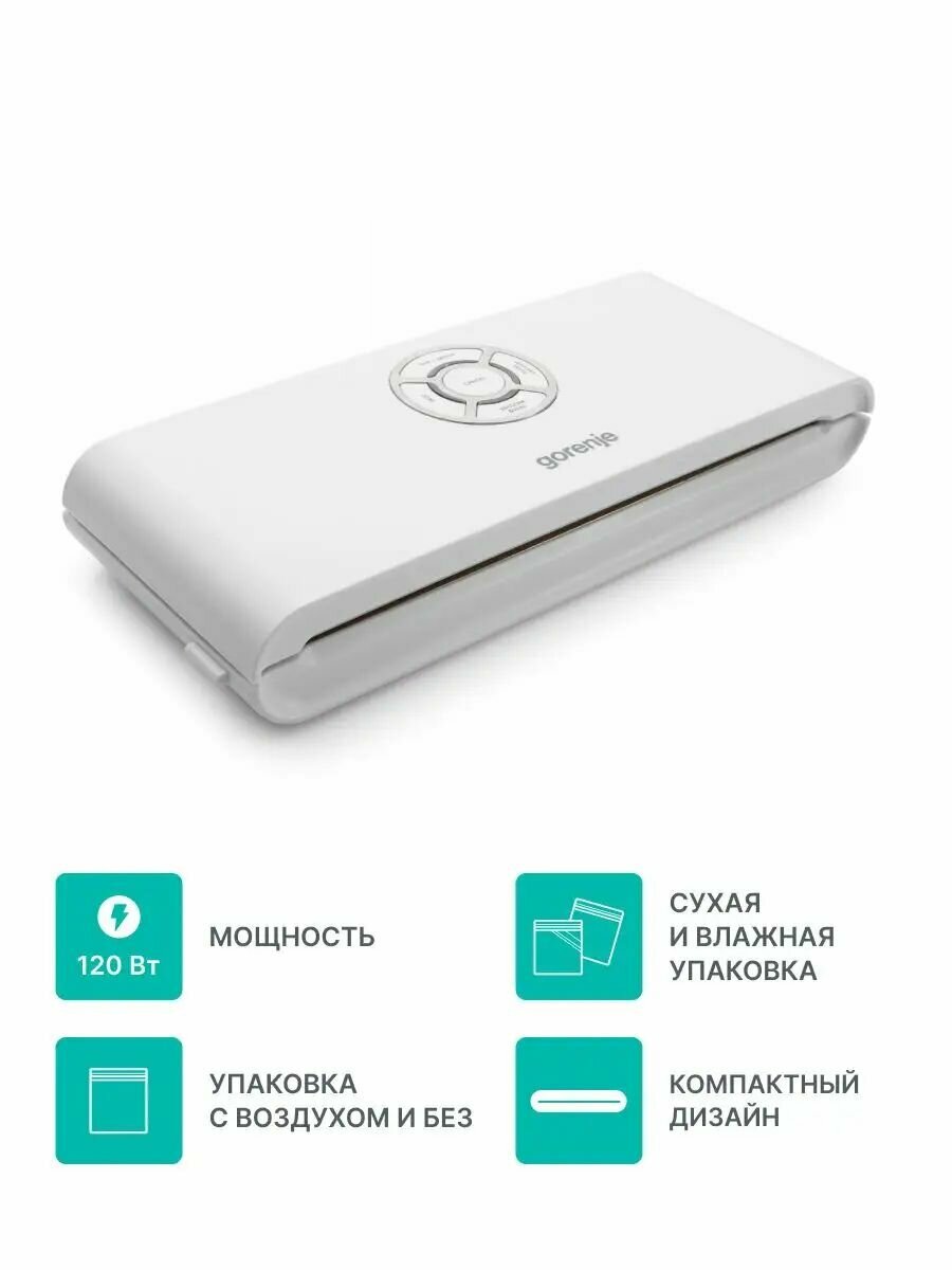 Вакууматор для продуктов Gorenje VS120W, 120 Вт, сухая и влажная упаковка, длина шва 300 мм, белый информация: