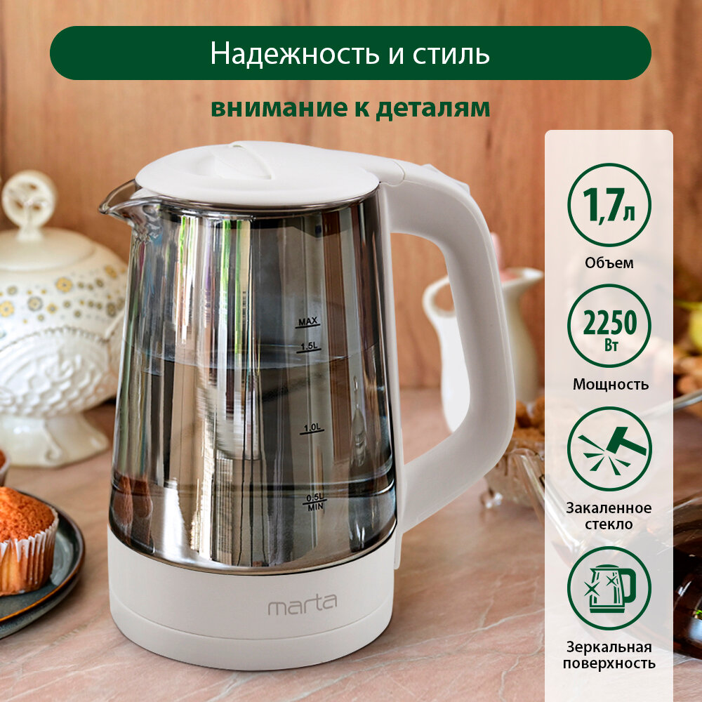 Электрический чайник MARTA MT-4610 белый стеклянный с подсветкой, 1,8 л