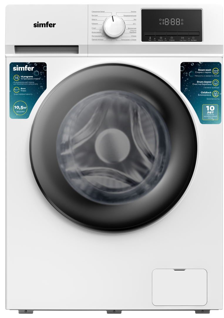 Стиральная машина Simfer WWC901, 10,5 кг загрузки, отжим 1400 об/мин, стирка паром информация:
