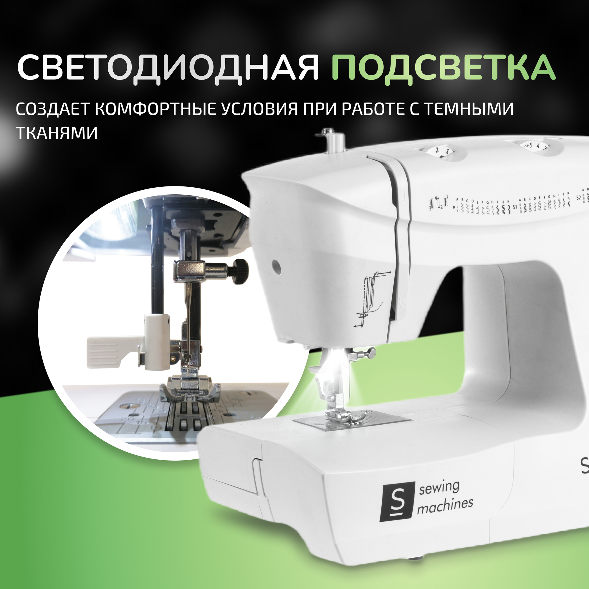 | Особенности конструкции | нитевдеватель, отсек для аксессуаров, подсветка, рукавная платформа |